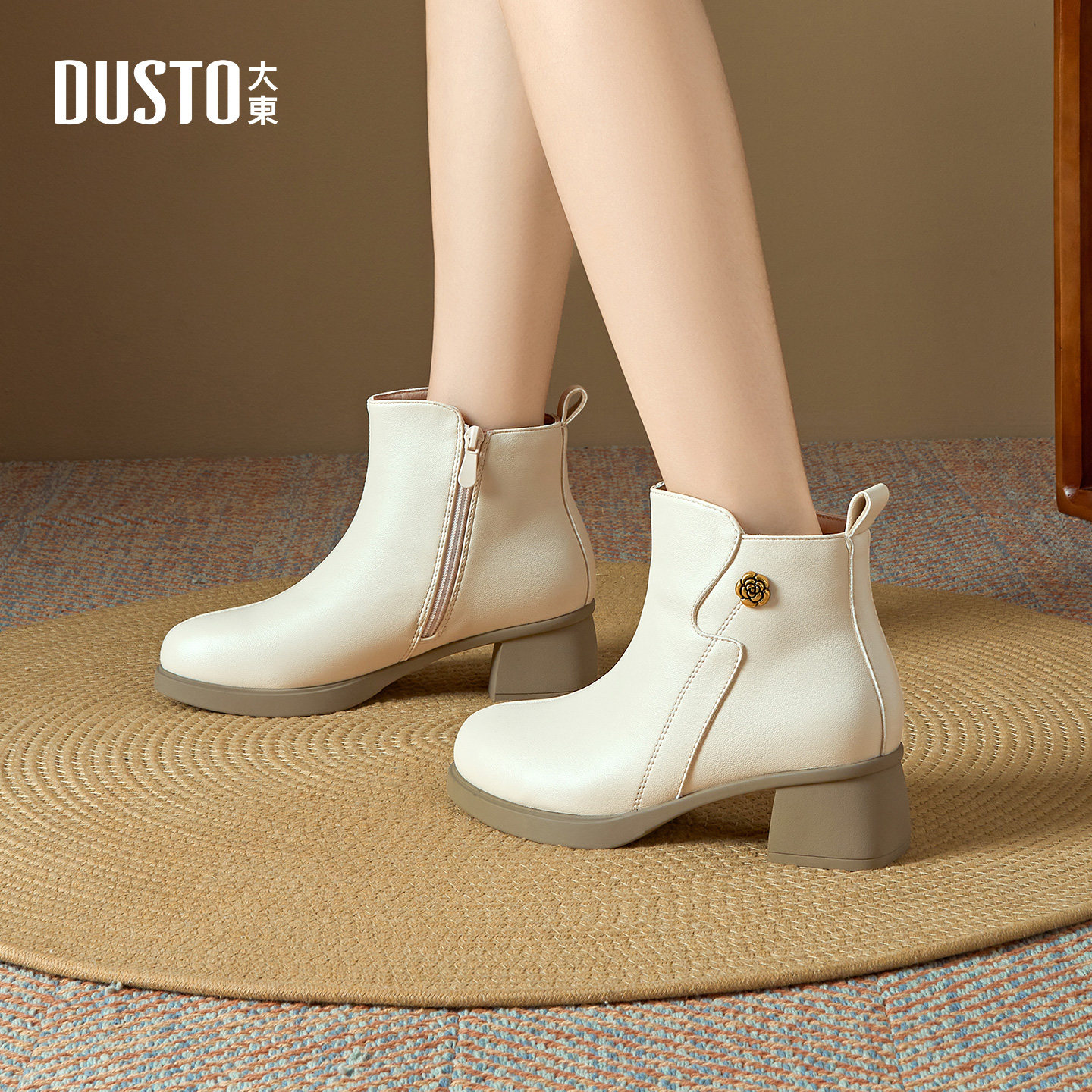 大东女靴时装靴2025冬季新款简约粗跟圆头女短靴侧拉链单里短筒靴