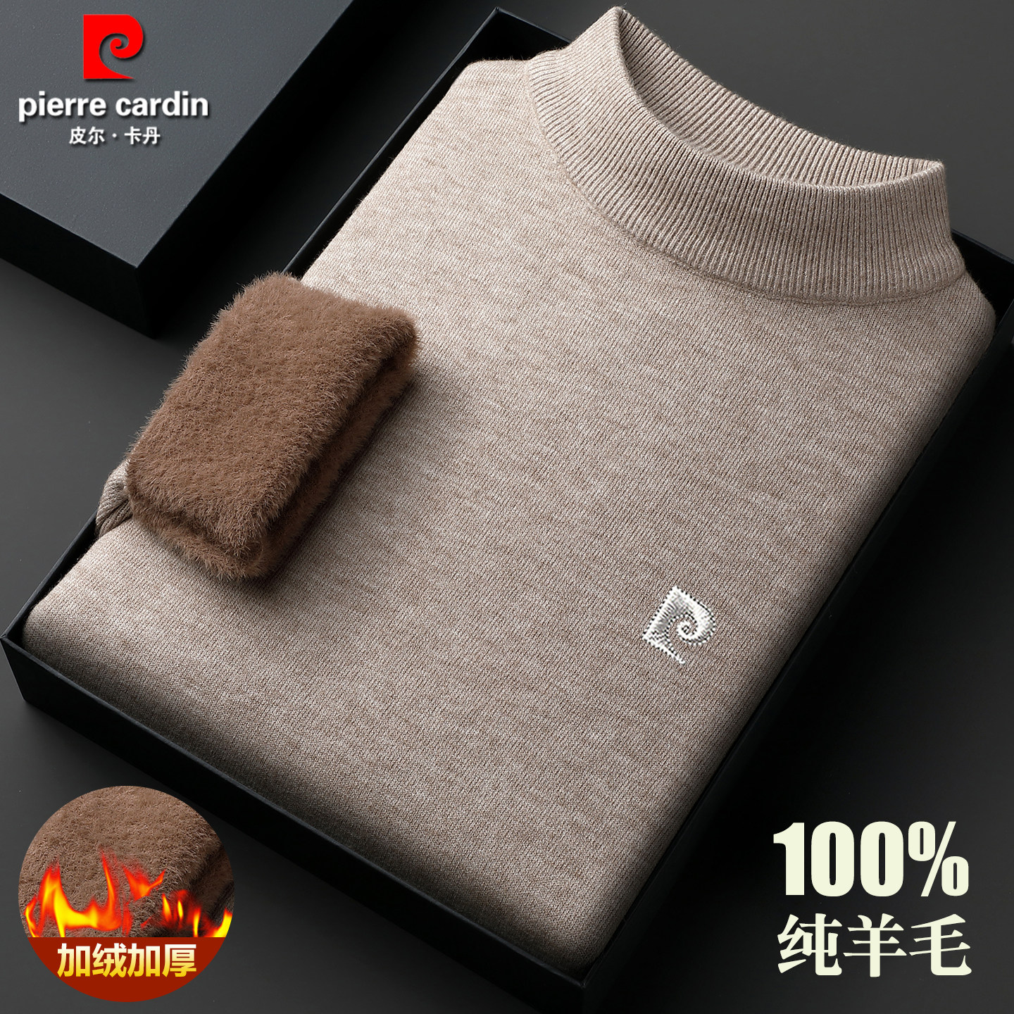 皮尔卡丹加绒加厚纯羊毛衫男士冬季半高领一体绒毛衣内搭打底衫