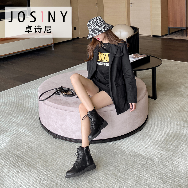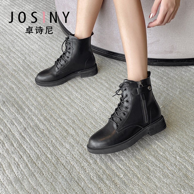 卓诗尼冬季新款女靴子短筒圆头系带时装休闲加绒加厚英伦风马丁靴