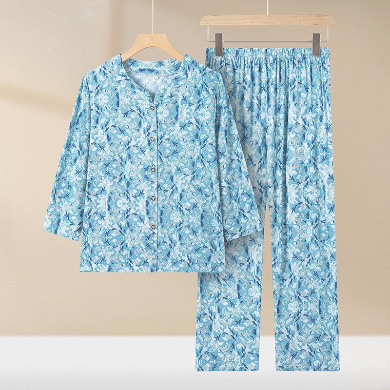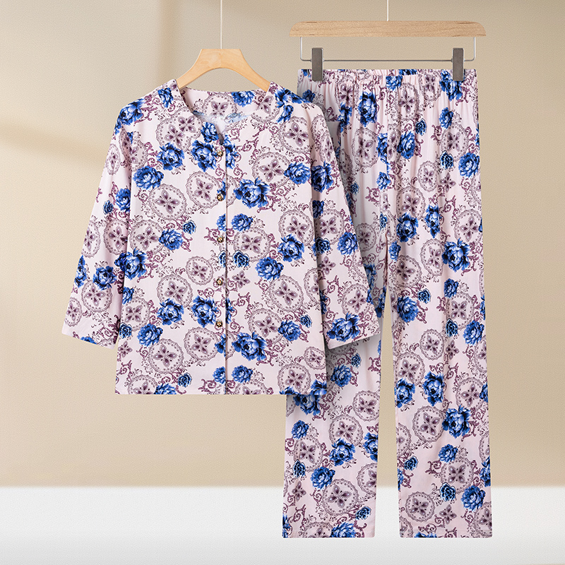 春夏绵绸新款中年妈妈棉绸睡衣女夏季长袖薄款家居服老人两件套装