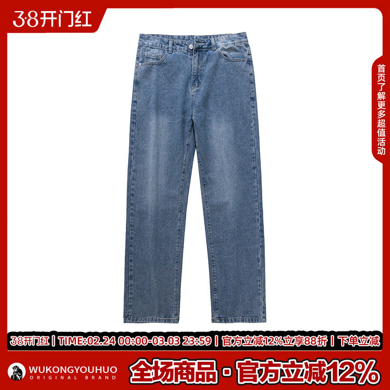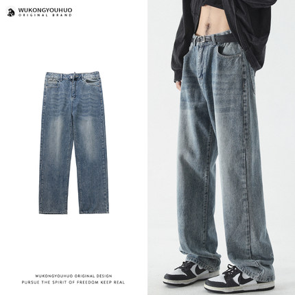 悟空有货潮牌复古做旧水洗直筒牛仔裤男街头宽松百搭阔腿休闲长裤