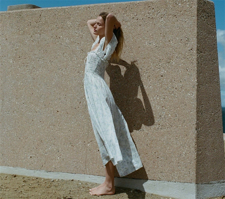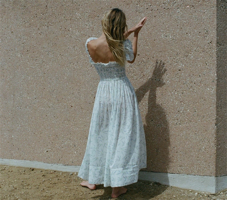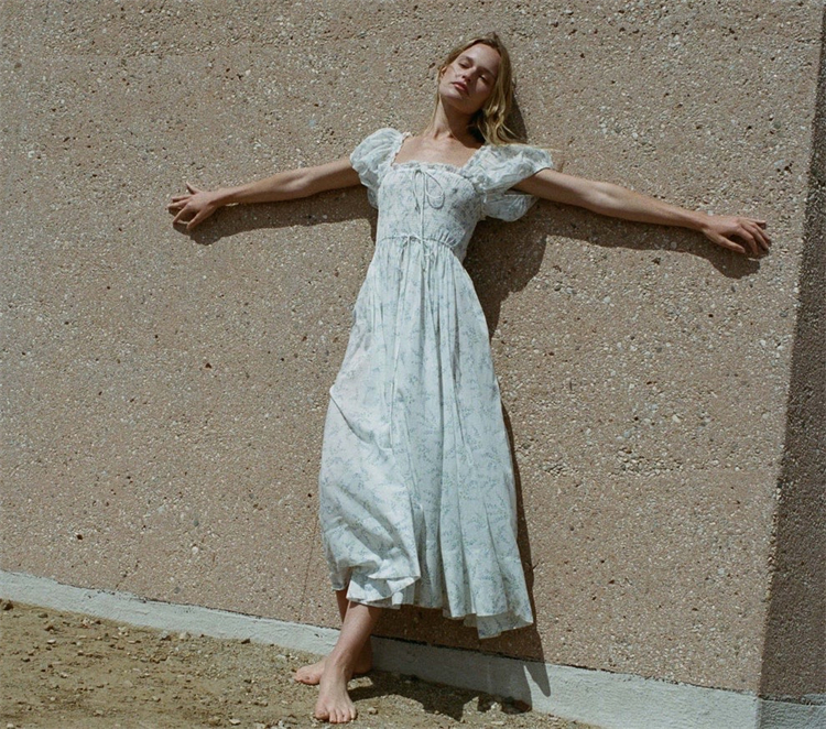 正品现货 DOEN23新款蓝色印花碎花方领泡泡袖系带连衣裙长裙女