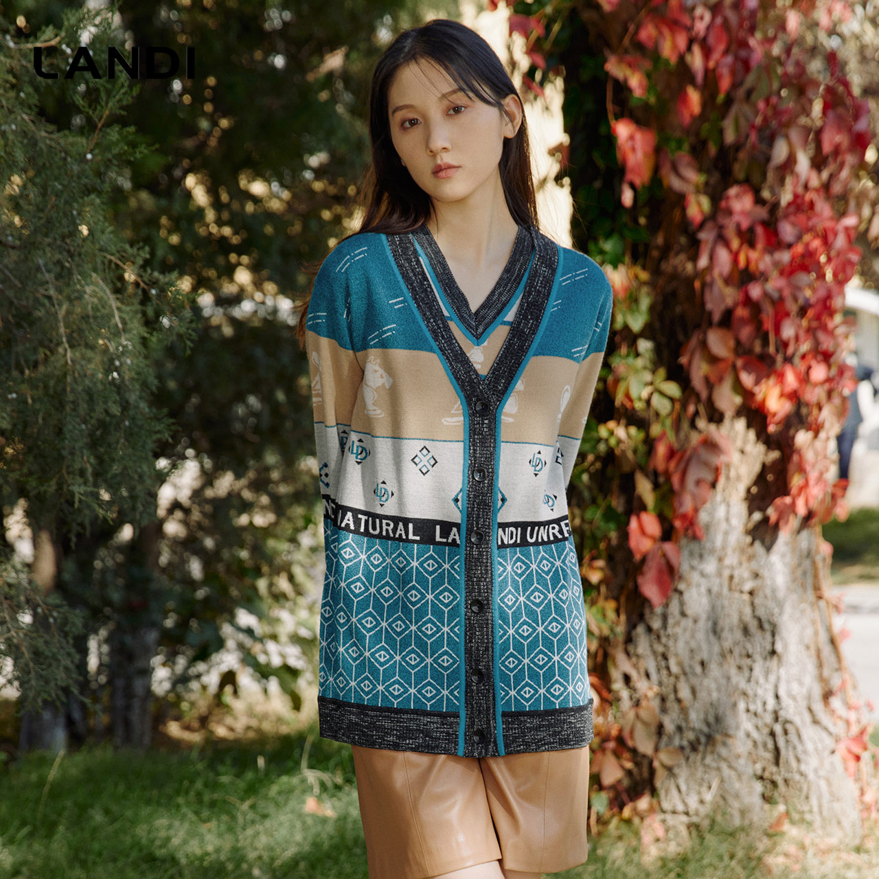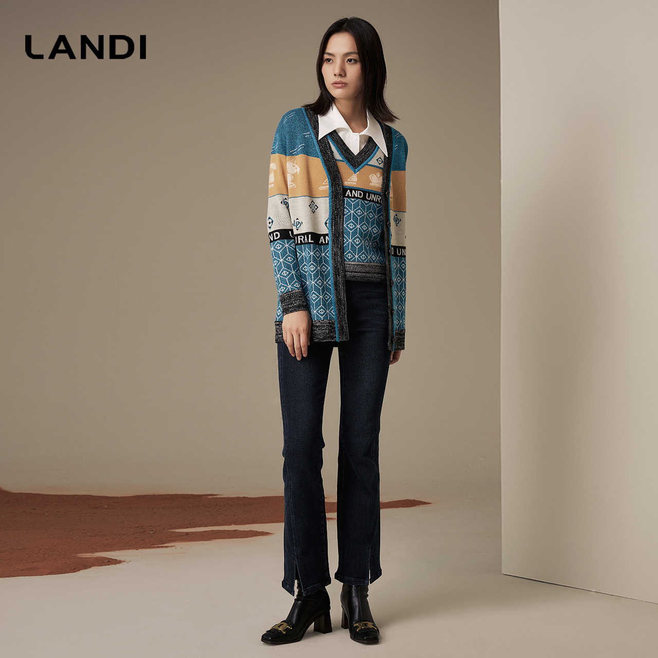 LANDI蓝地复古英伦学院风羊毛几何提花针织开衫女外搭上衣冬新品