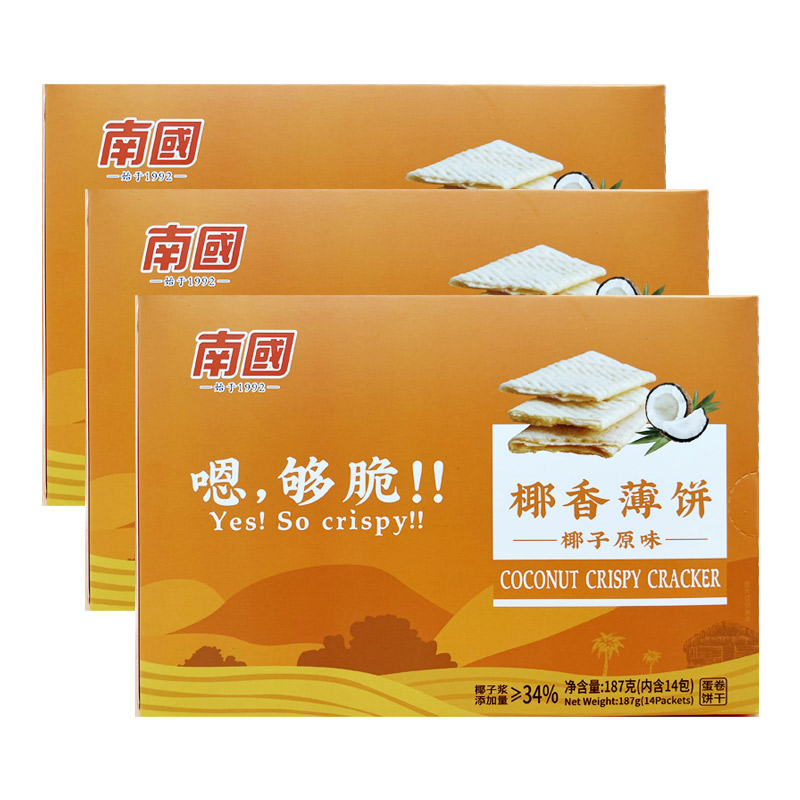 海南特产 南国椰香薄饼椰子原味187克X3盒蛋卷饼干零食下午茶点心