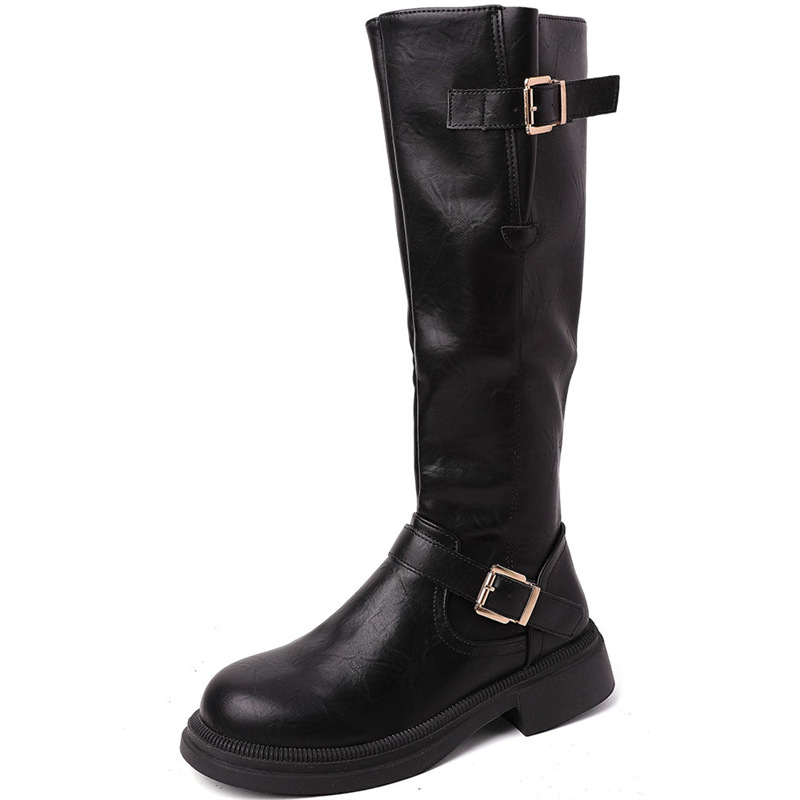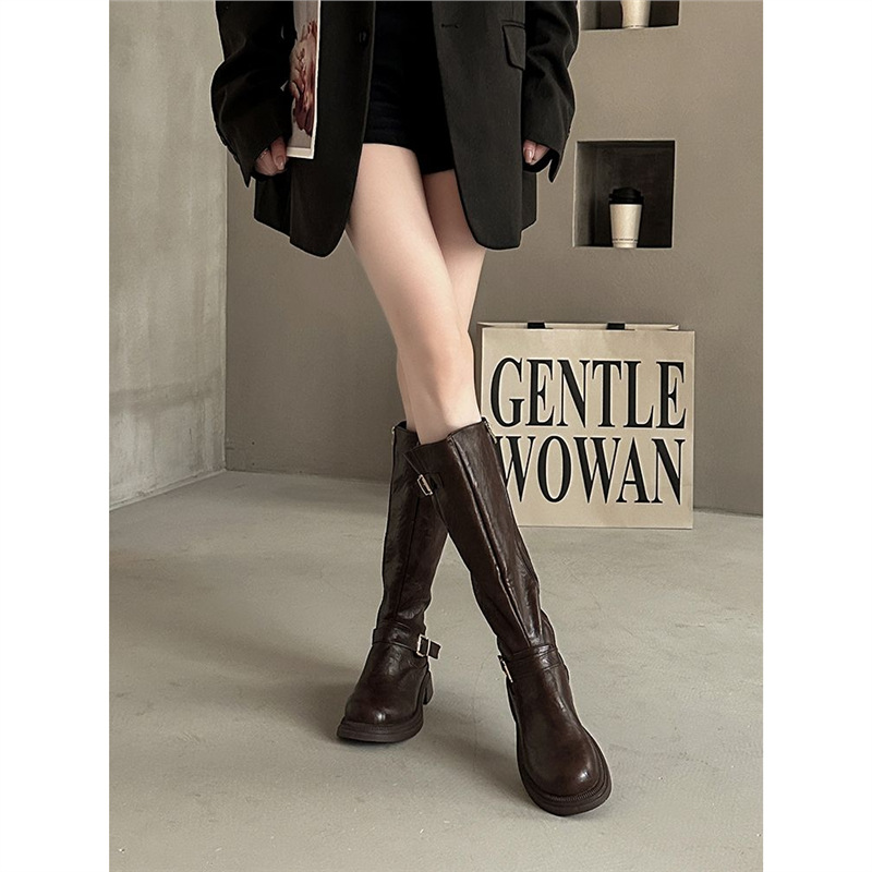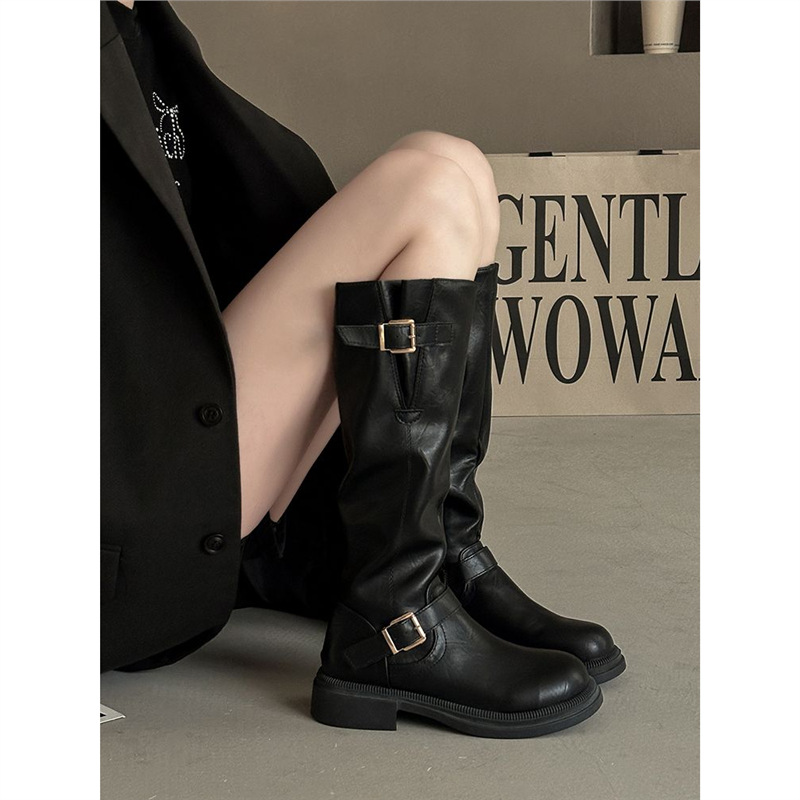 英伦风复古圆头粗跟长筒靴女士2025夏季新款经典气质皮带扣骑士靴