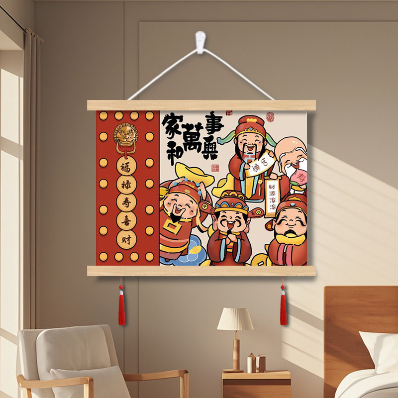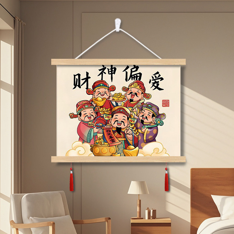五路财神爷配电表箱盒遮挡装饰画挂画客厅餐厅卧室墙壁布艺横款轴
