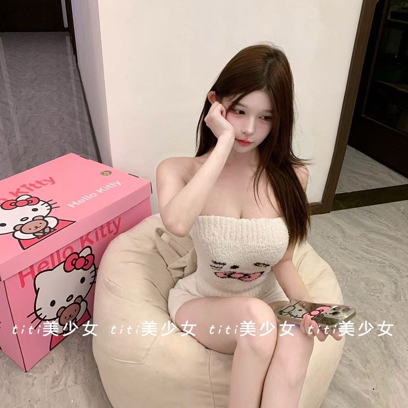 【TiTi美少女】纯欲风kitty白色短款针织卡通印花抹胸背心上衣女