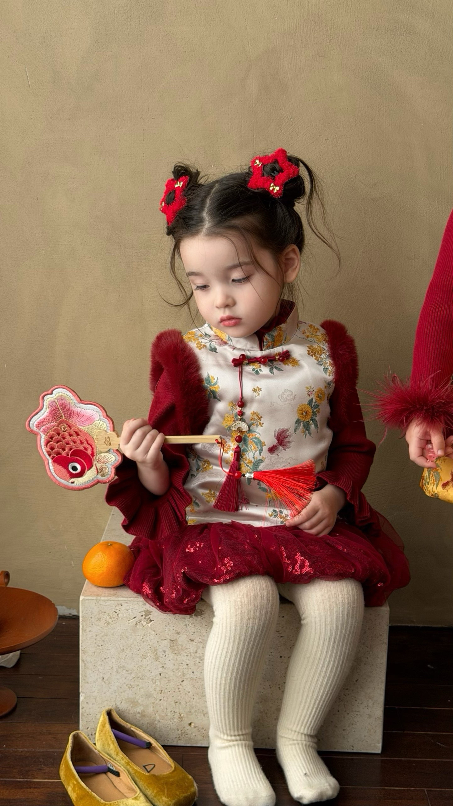 女童2025冬新款女童新中式国风提花马甲蓬蓬亮片纱年服旗袍背心裙
