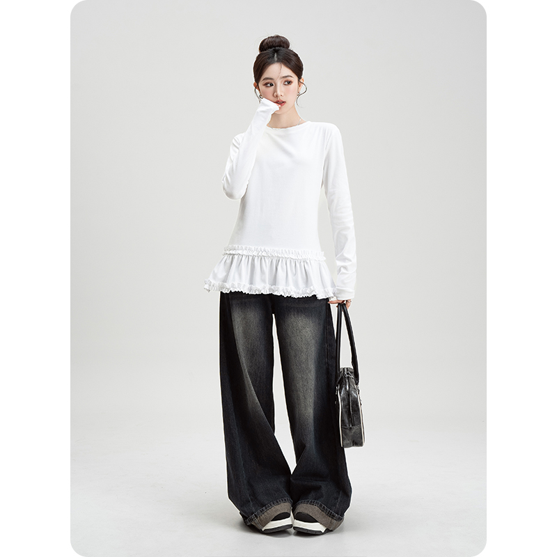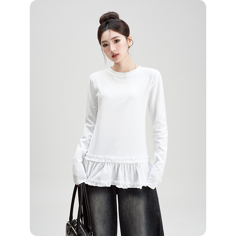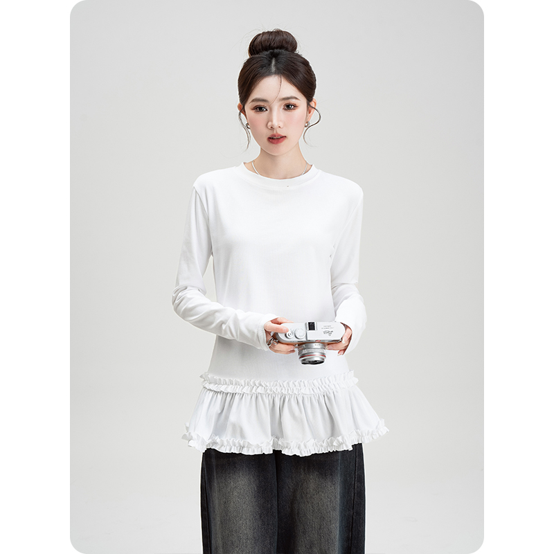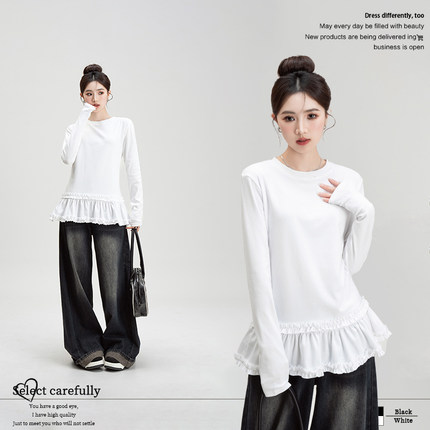 白色芭蕾风拼接长袖T恤秋季新款女装修身内搭打底衫花边下摆上衣