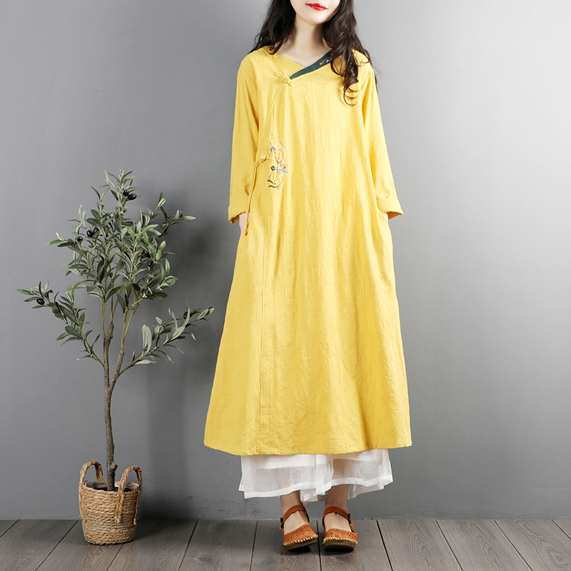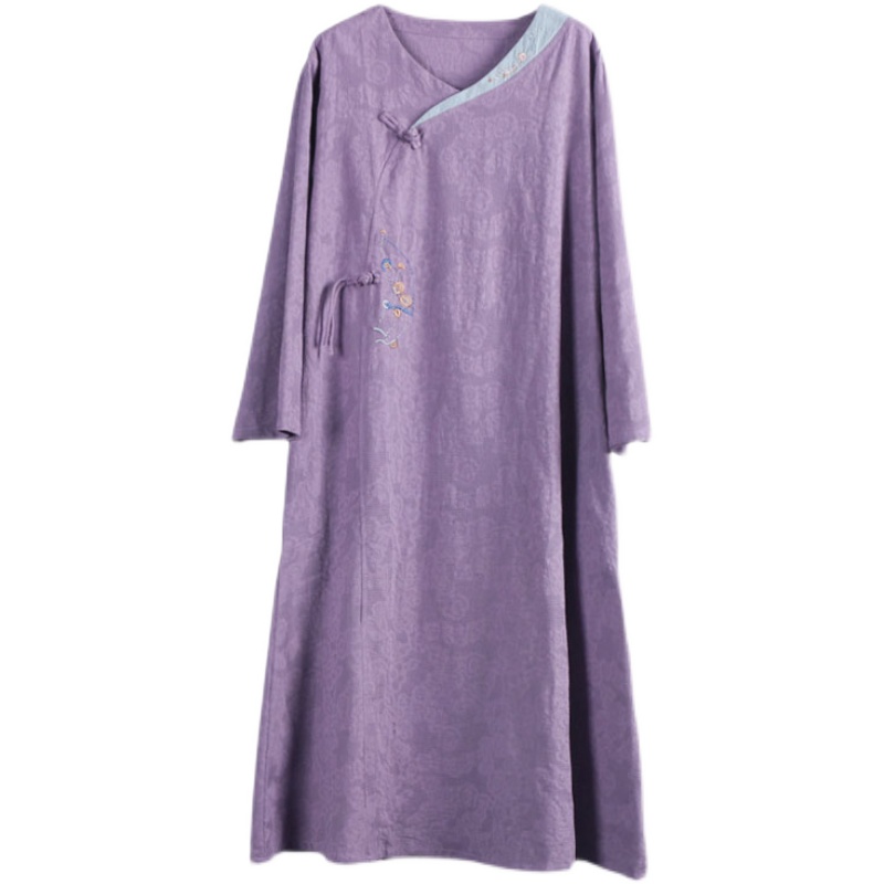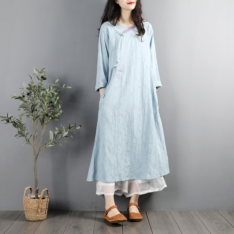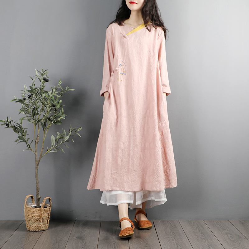 新中式文艺复古盘扣旗袍棉麻连衣裙女春秋长袖中国风禅意茶服长裙
