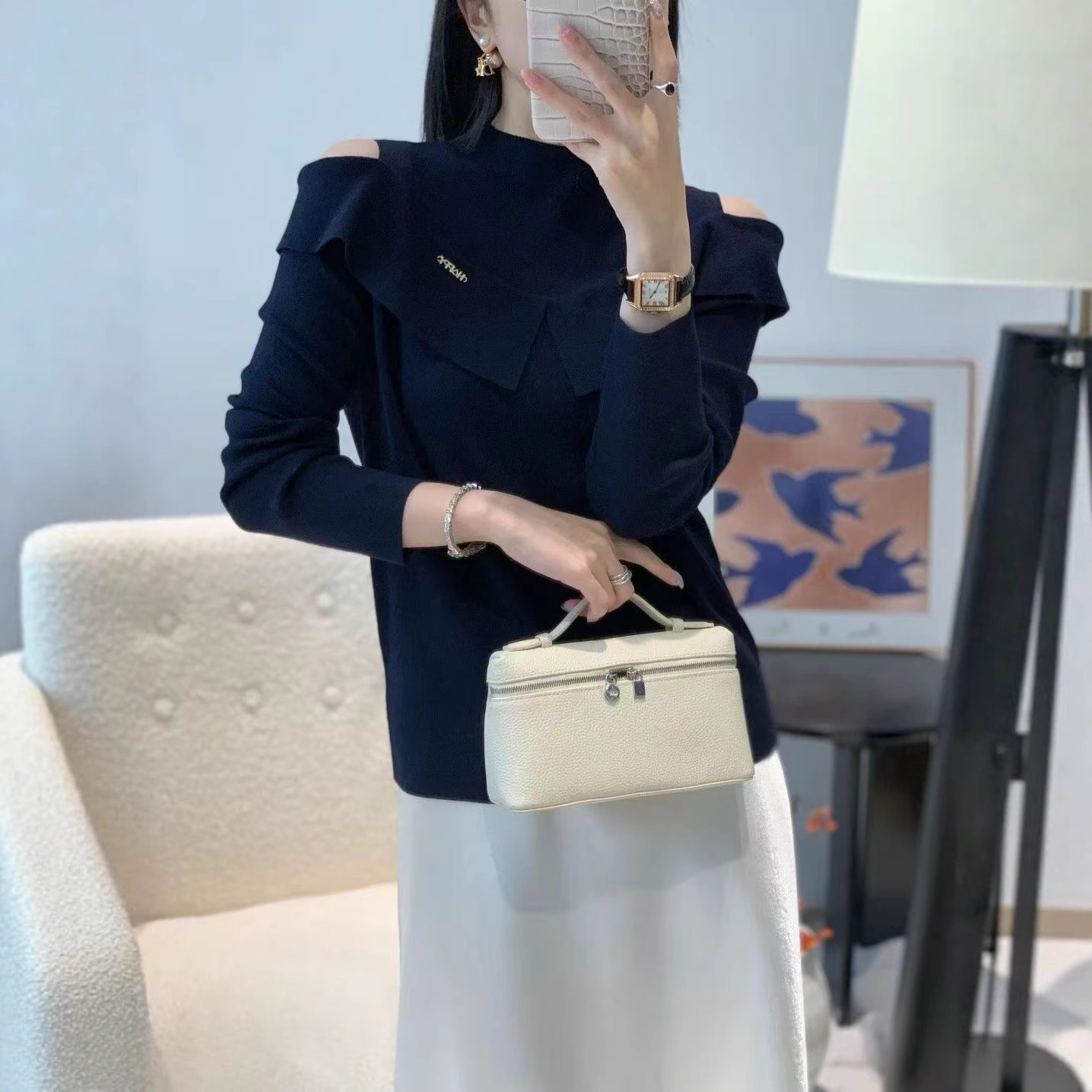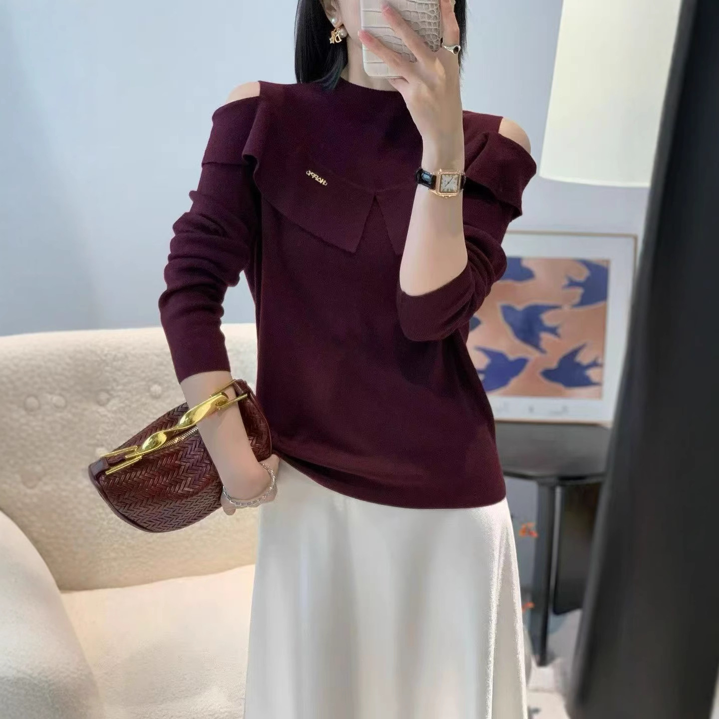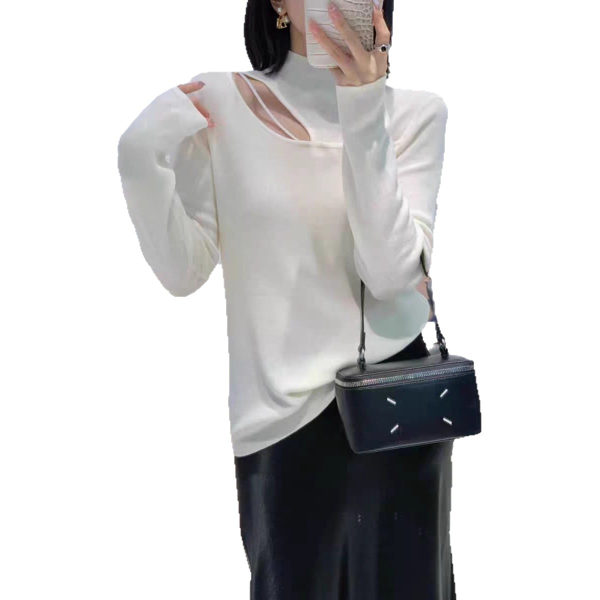 HR欧货高级感半高领针织衫女2025新款露肩荷叶边字母标打底衫上衣