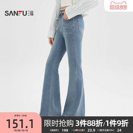三福牛仔裤女2025新款秋季蕾丝花边微喇裤复古喇叭裤子女装504794