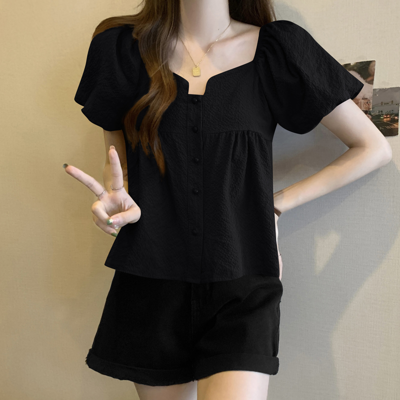 法式正肩方领单排扣短袖衬衫女