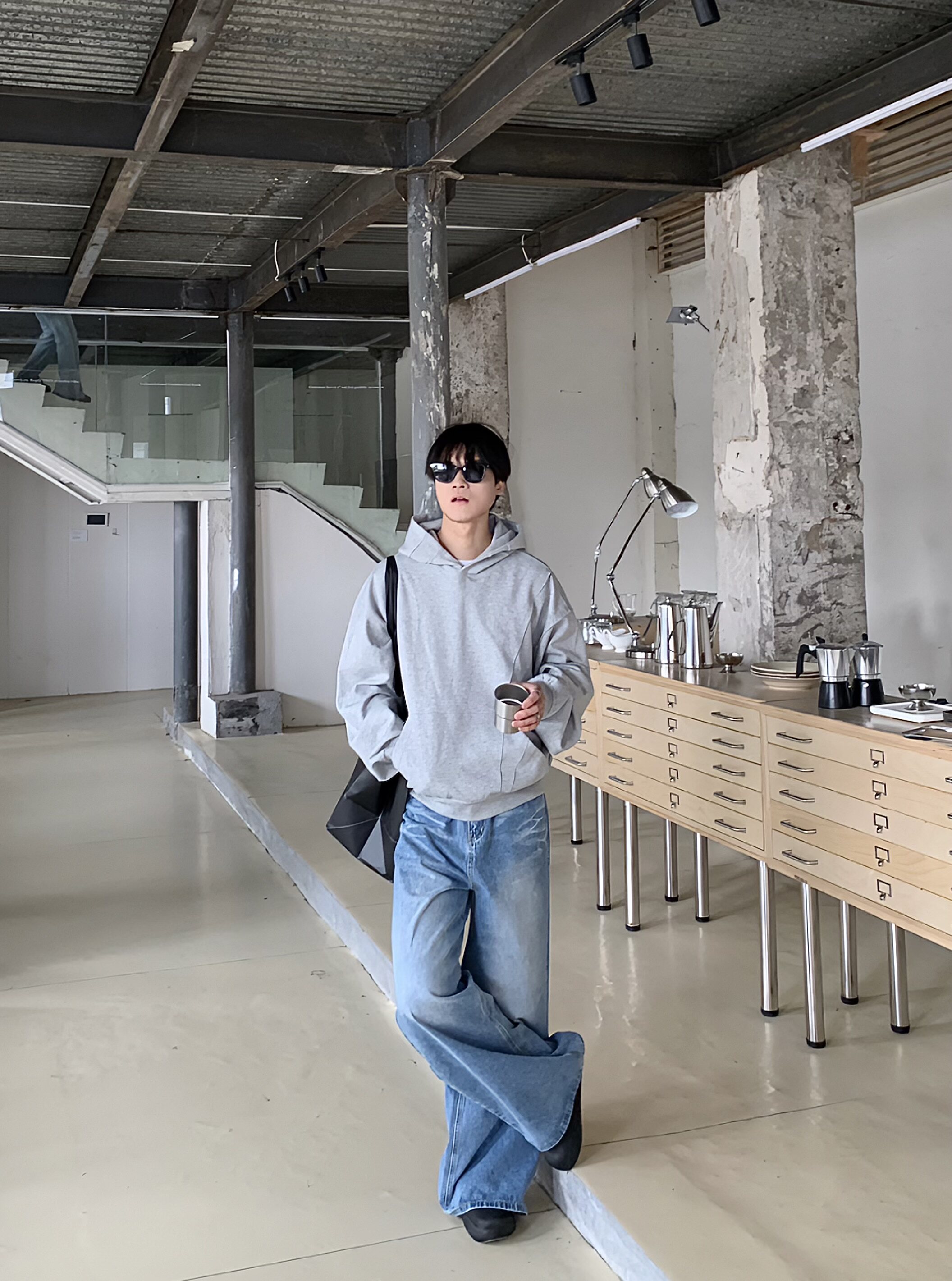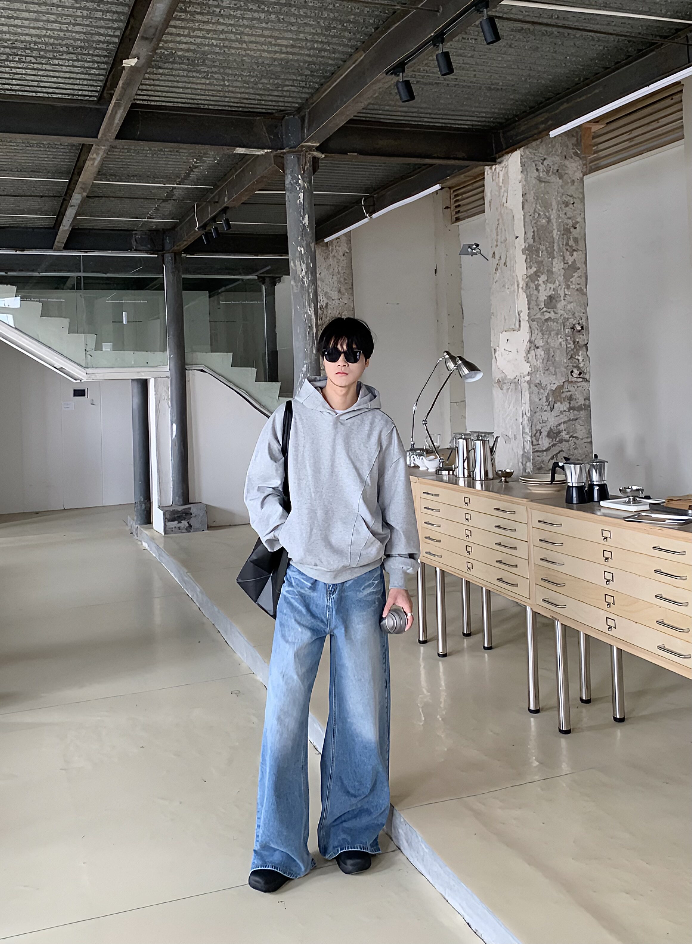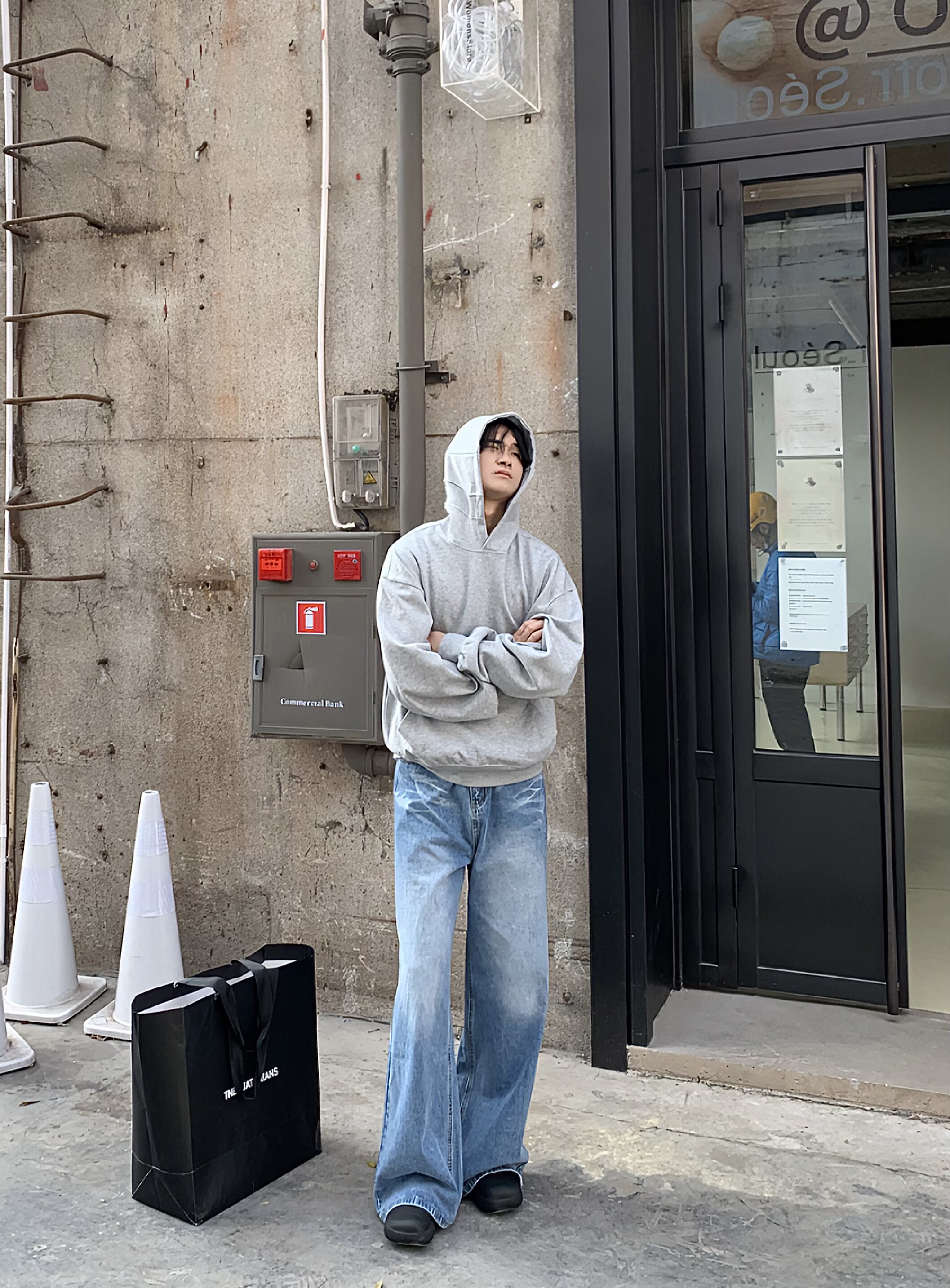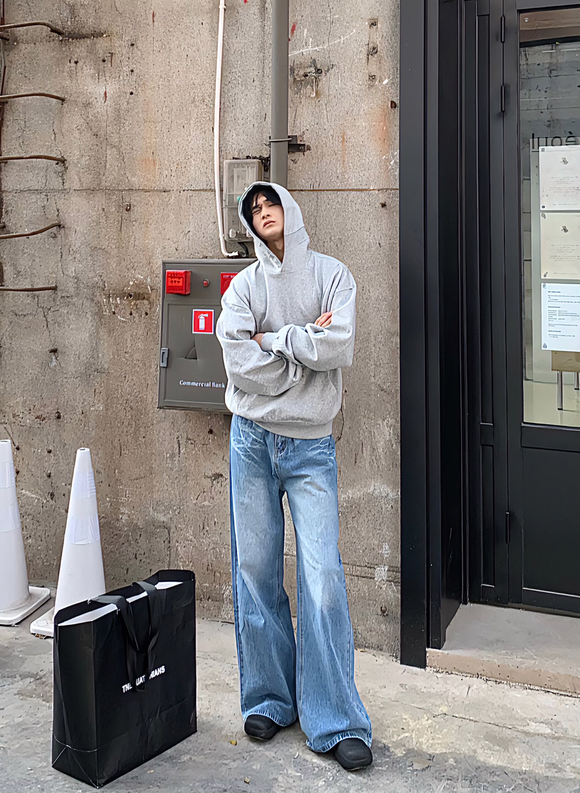 BEANCURD 韩版宽松直筒浅蓝色牛仔裤高腰垂感水洗做旧磨白阔腿裤