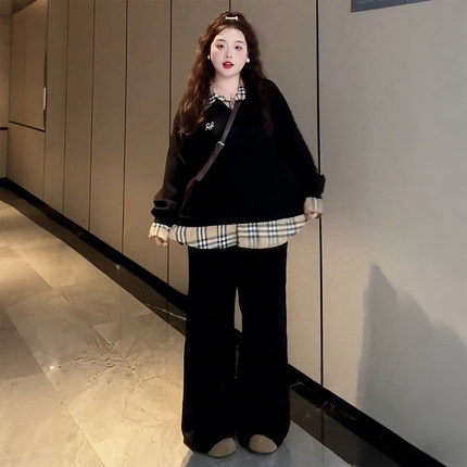大码女装胖mm韩版设计感假两件卫衣女学院风格纹拼接宽松百搭上衣