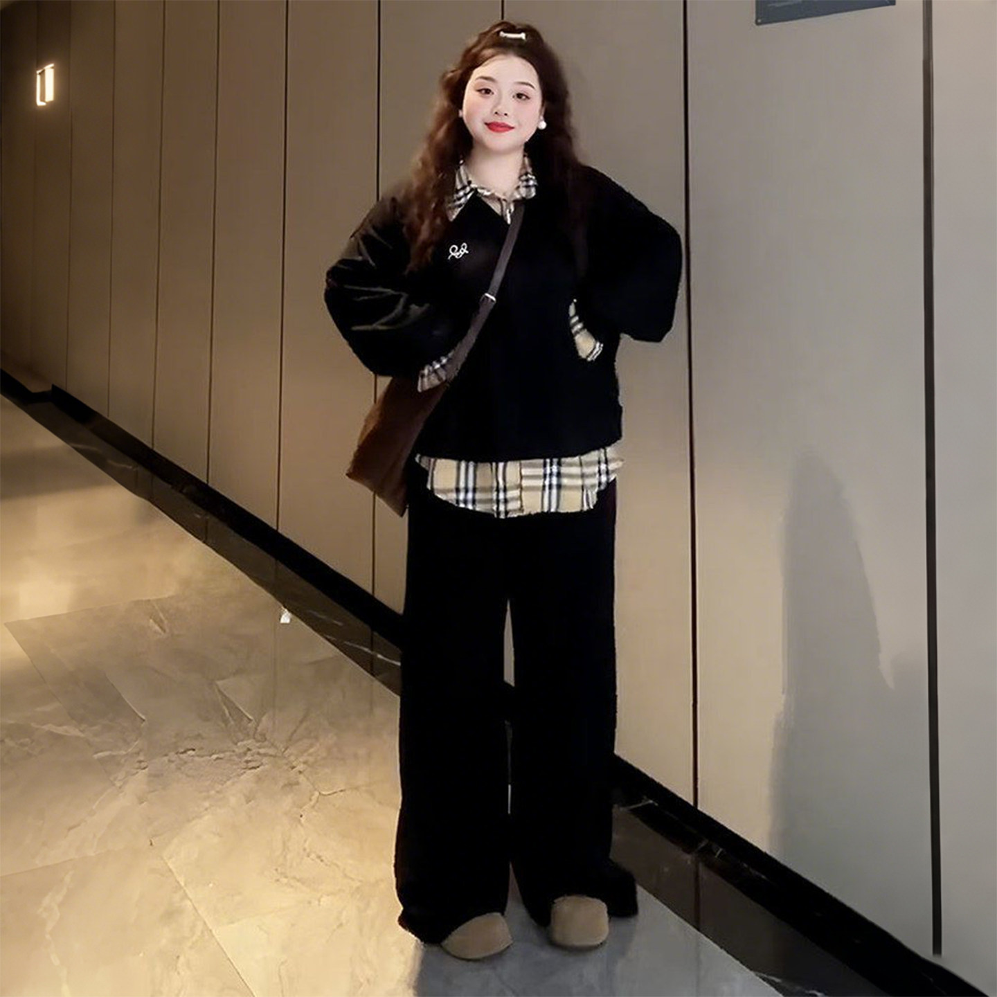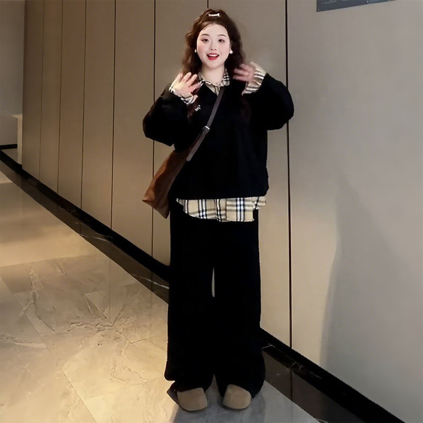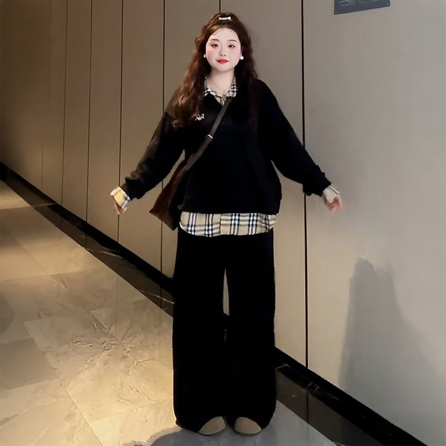 大码学院风假两件格纹拼接卫衣