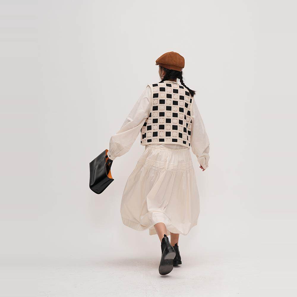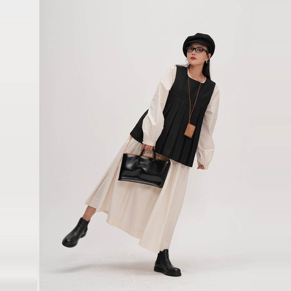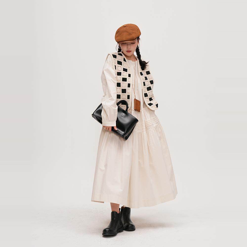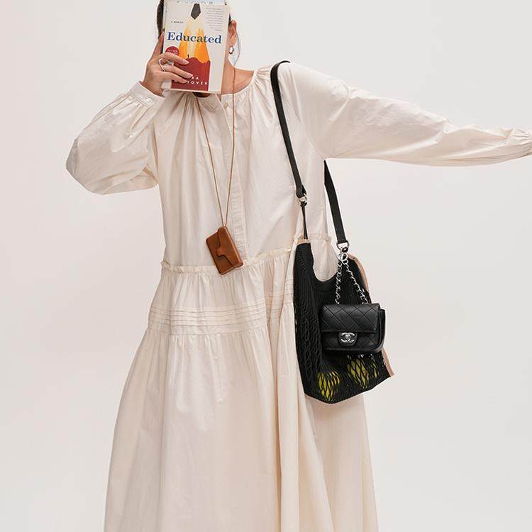 羊脂米白色全棉拼接插肩袖宽松圆领连衣裙秋冬百搭直筒长袖裙子