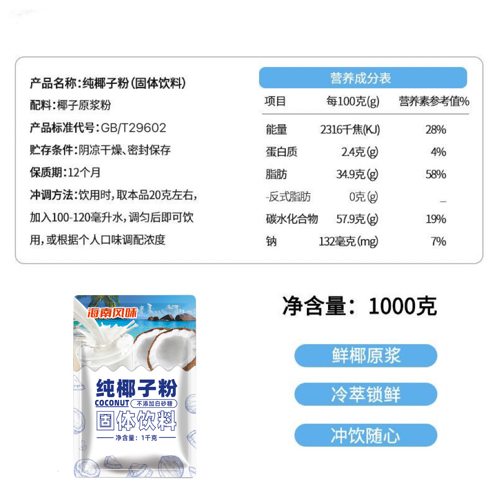 南国椰子粉商用1kg纯椰粉无糖精无添加速溶椰奶粉椰汁粉海南特产