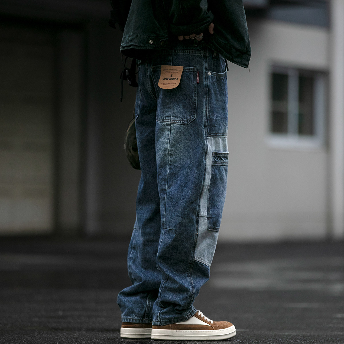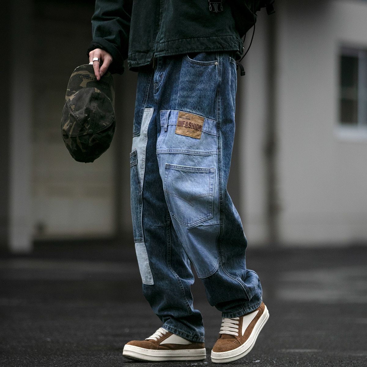 秋冬复古水洗重磅15盎司解构贴布牛仔裤男潮牌宽松工装哈伦长裤潮
