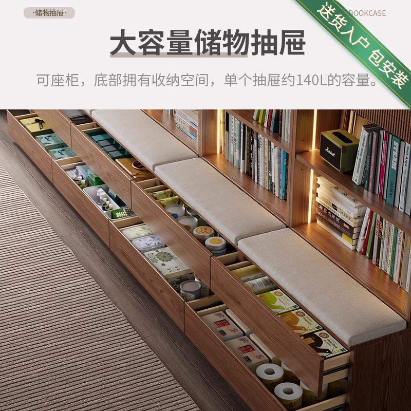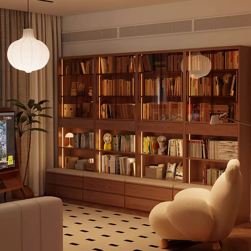 实木卡座书柜一体整墙组合带玻璃门书架展示柜客厅靠墙书橱储物柜