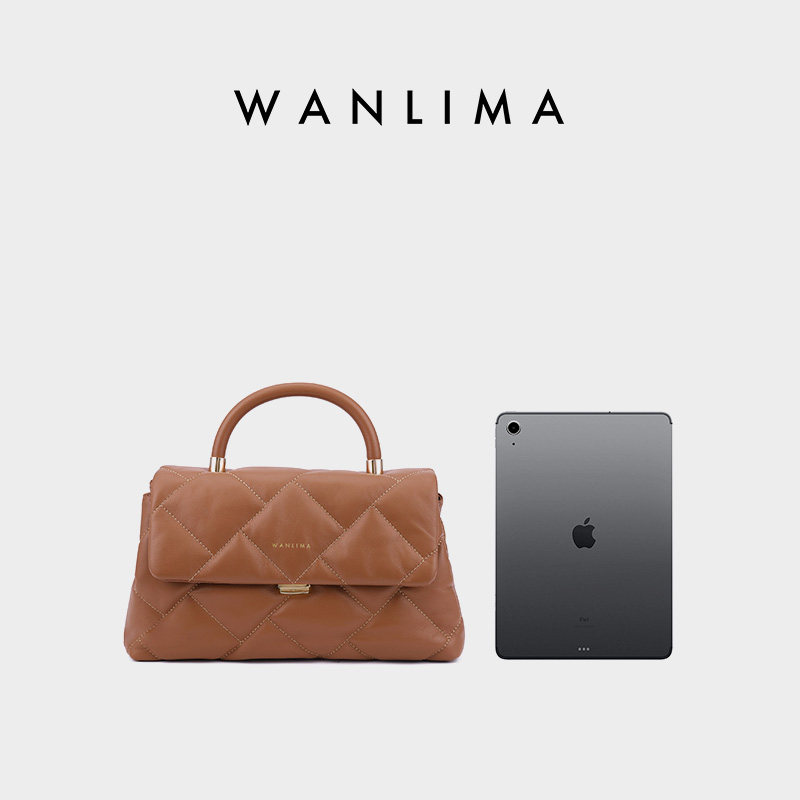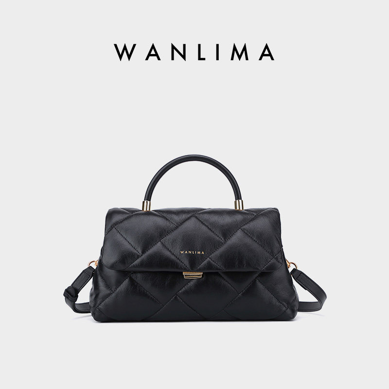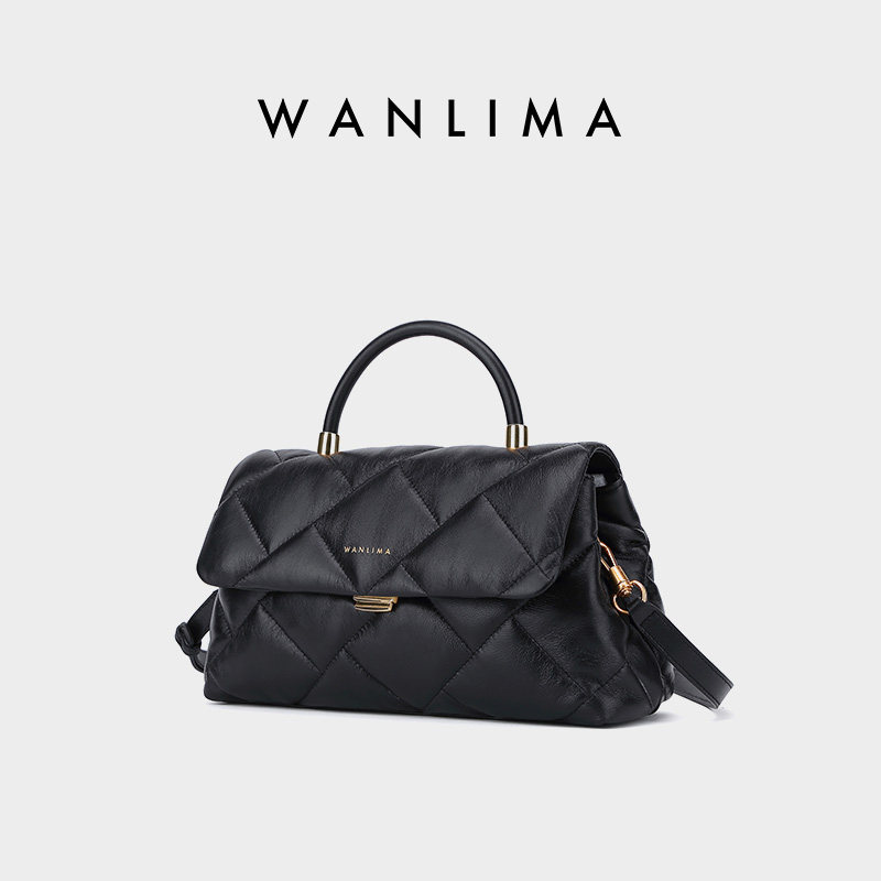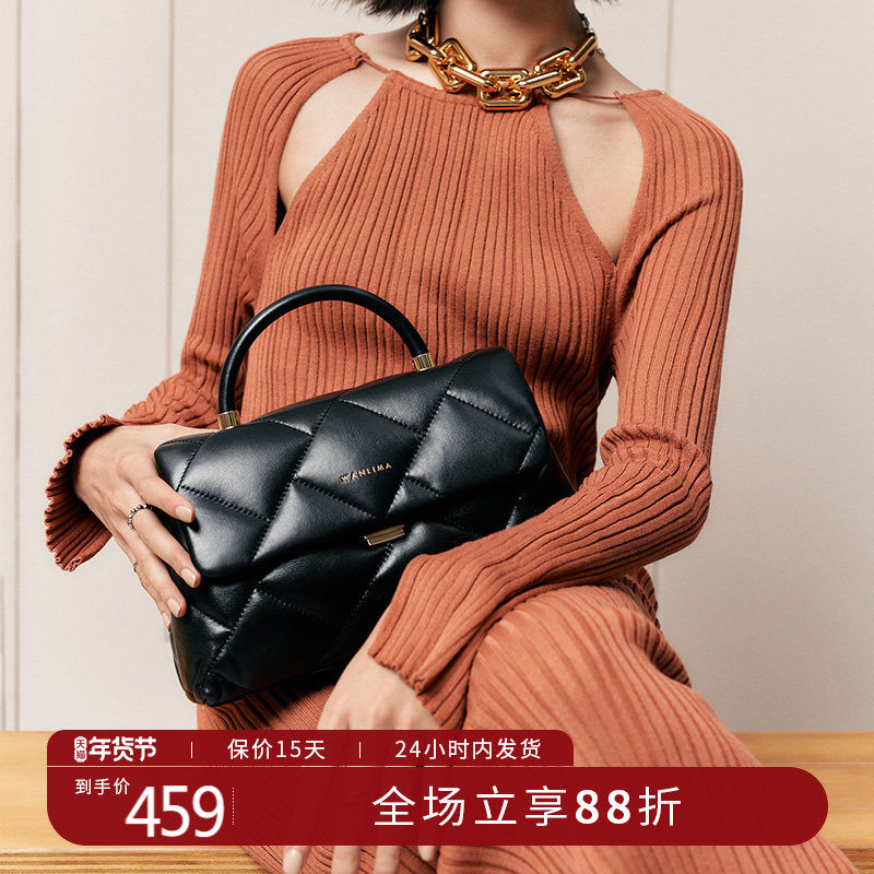 万里马羊皮泡芙包女菱格小香风手提包软皮真皮单肩包小众白色链条