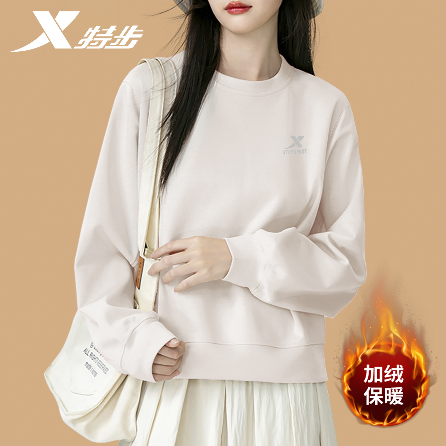 特步加绒卫衣女新款纯色打底衫圆领套头长袖上衣正品宽松运动服女