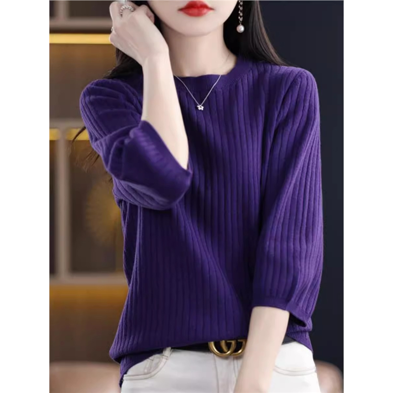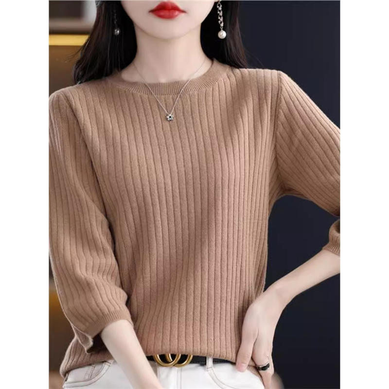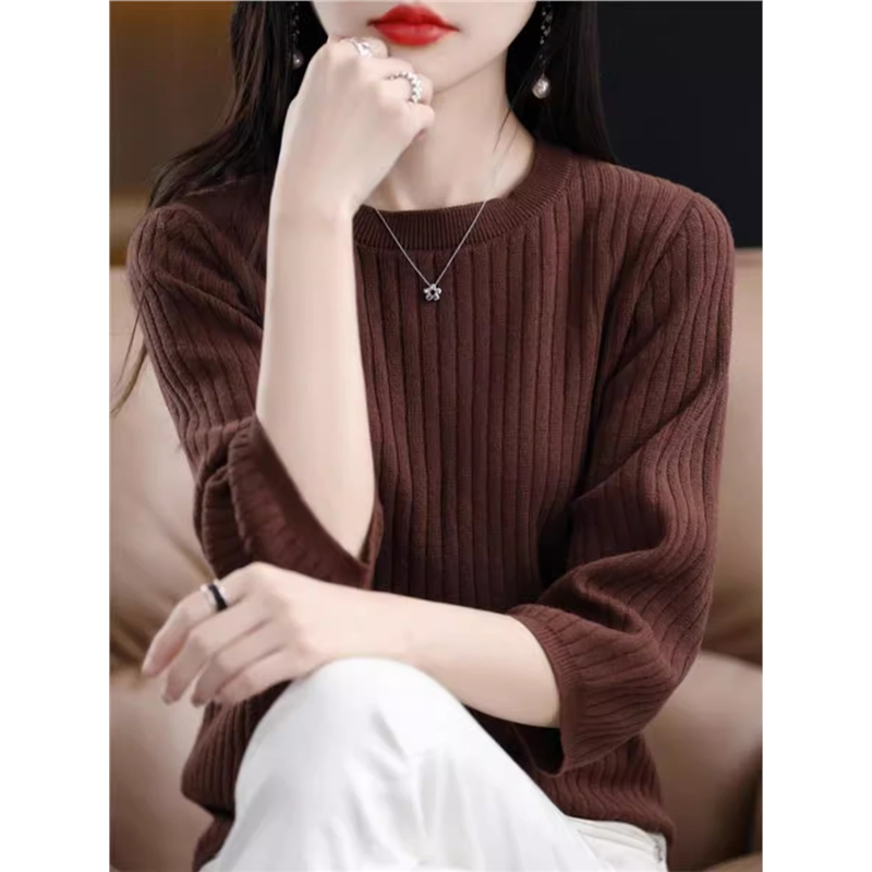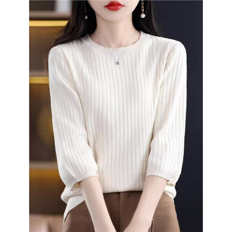 洋气小衫纯棉线七分袖打底针织衫女圆领套头中袖毛衣宽松短款上衣