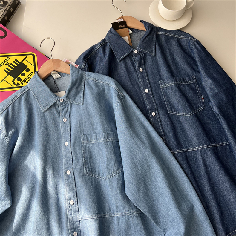 长袖日系复古水洗纯棉牛仔衬衫