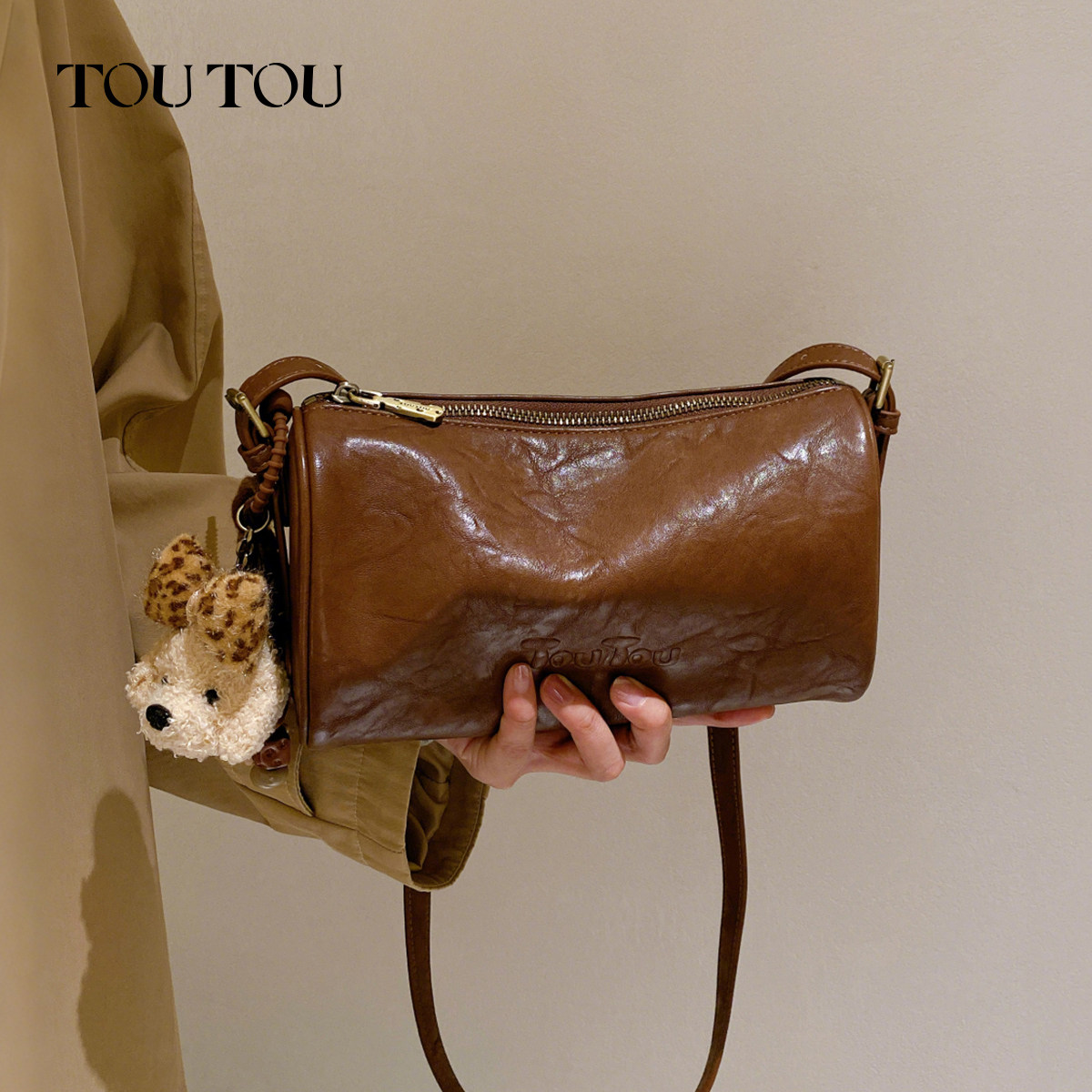 TOUTOU新款豹纹小狗圆筒包大容量波士顿笔筒腋下包可爱单肩斜挎包