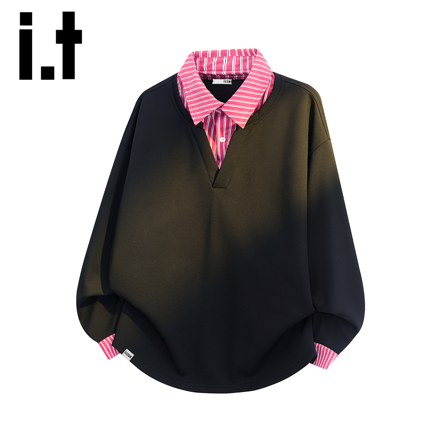 it izzue 衬衫领假两件卫衣男款2025春秋新款潮牌长袖上衣POLO衫Y