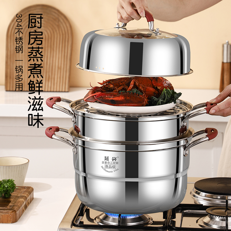 蒸锅家用304不锈钢蒸笼三层双层蒸煮锅炖汤加厚电磁炉煤气灶通用