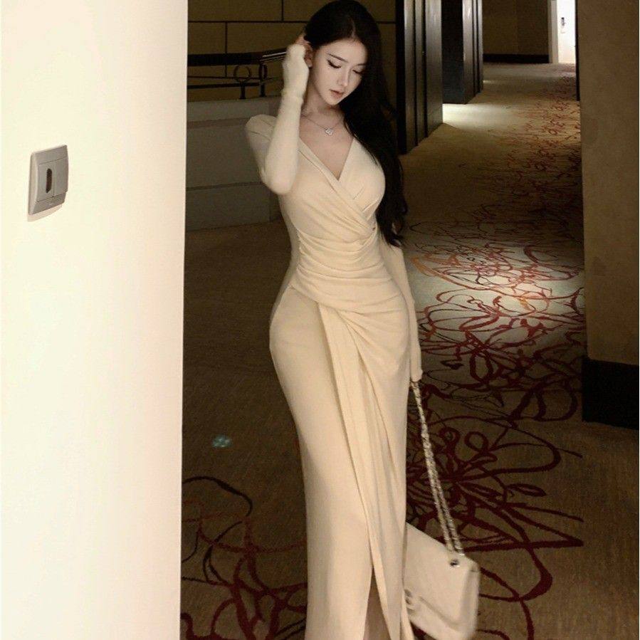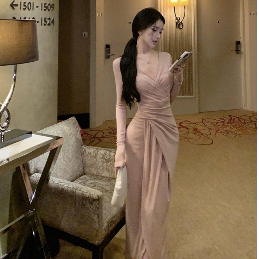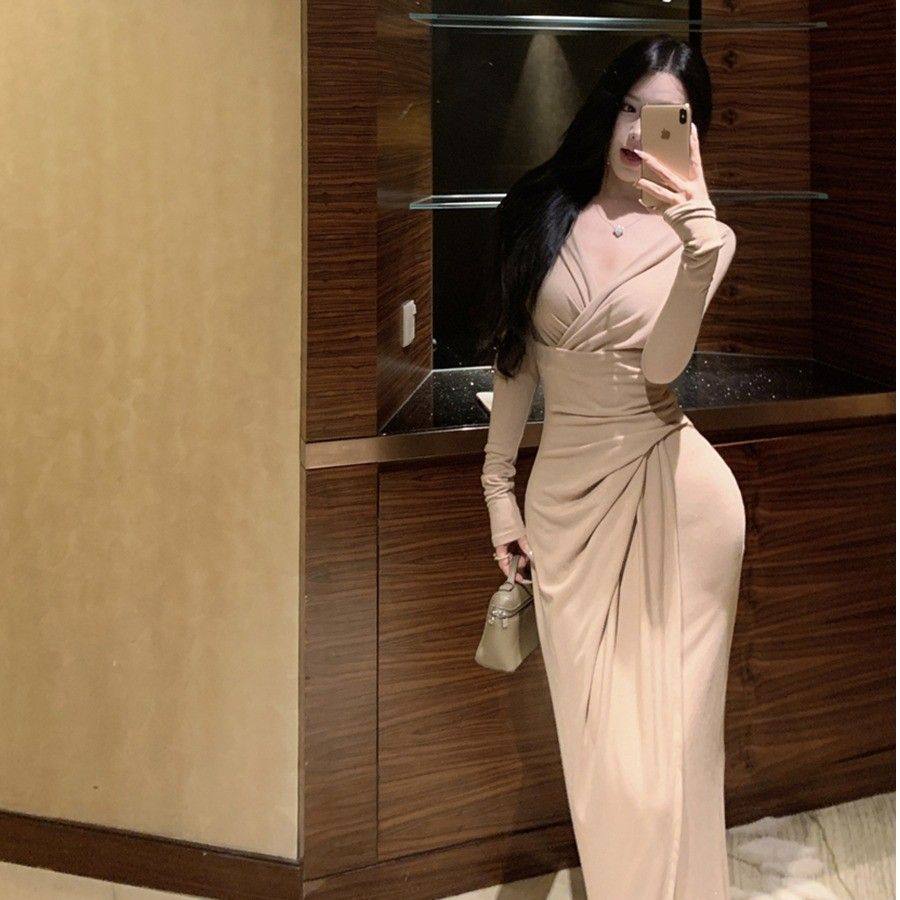 御姐风交叉v领长袖连衣裙女秋季褶皱修身气质中长款收腰包臀裙子