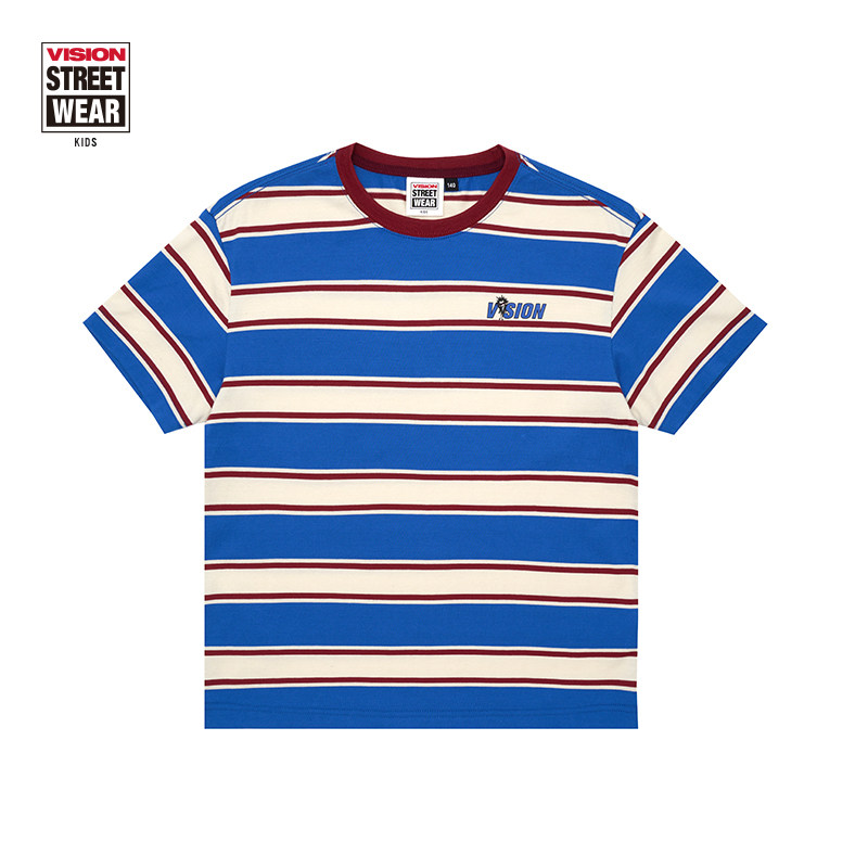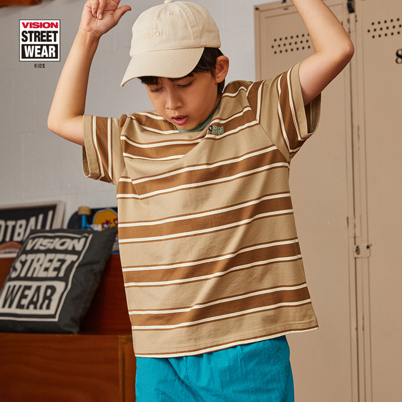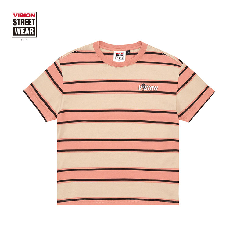 VISION KIDS 童装男女儿春夏款美式街头撞色条纹夏季宽松短袖T恤