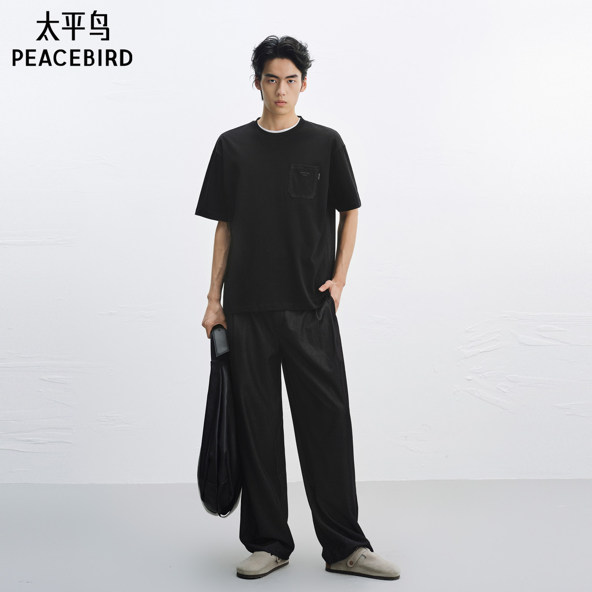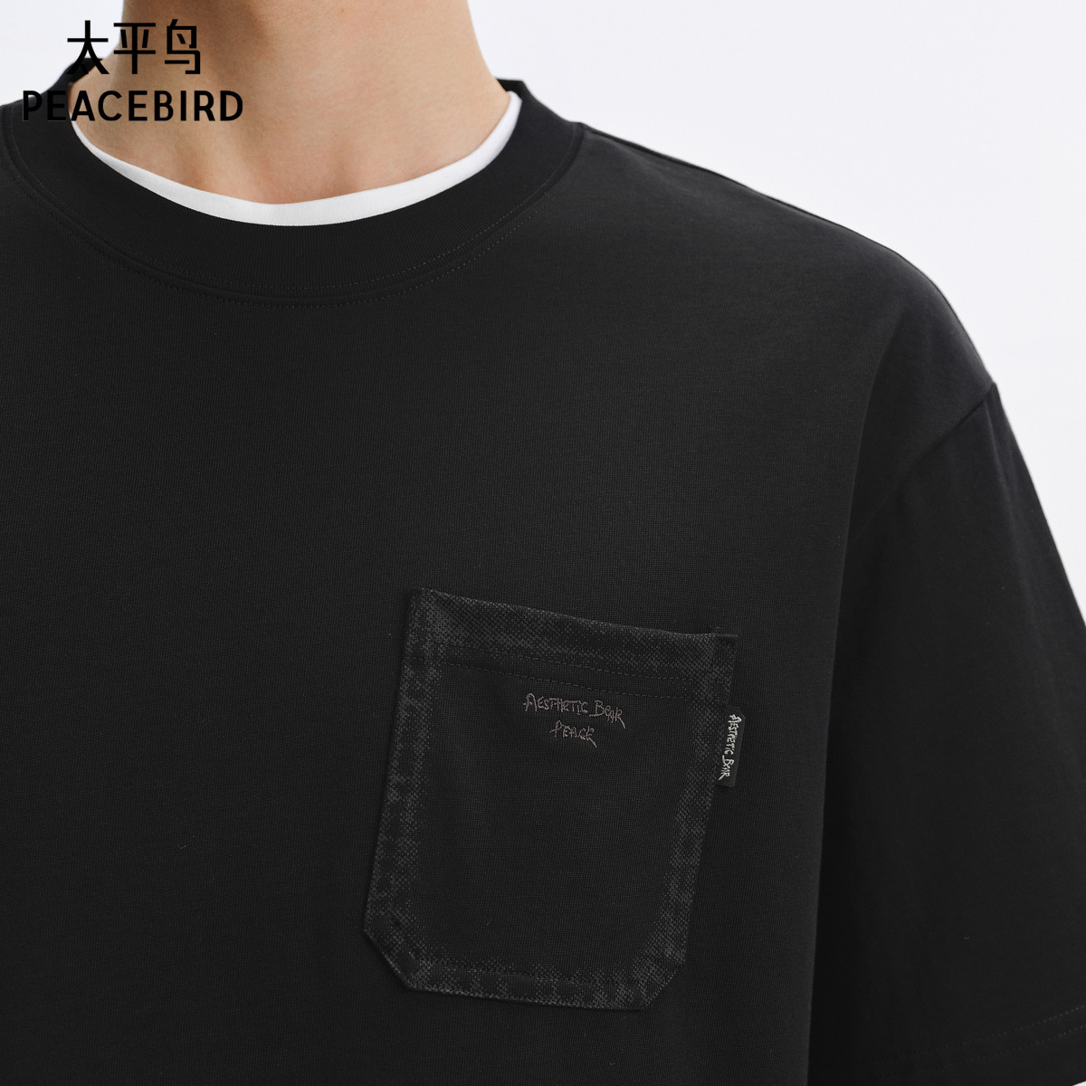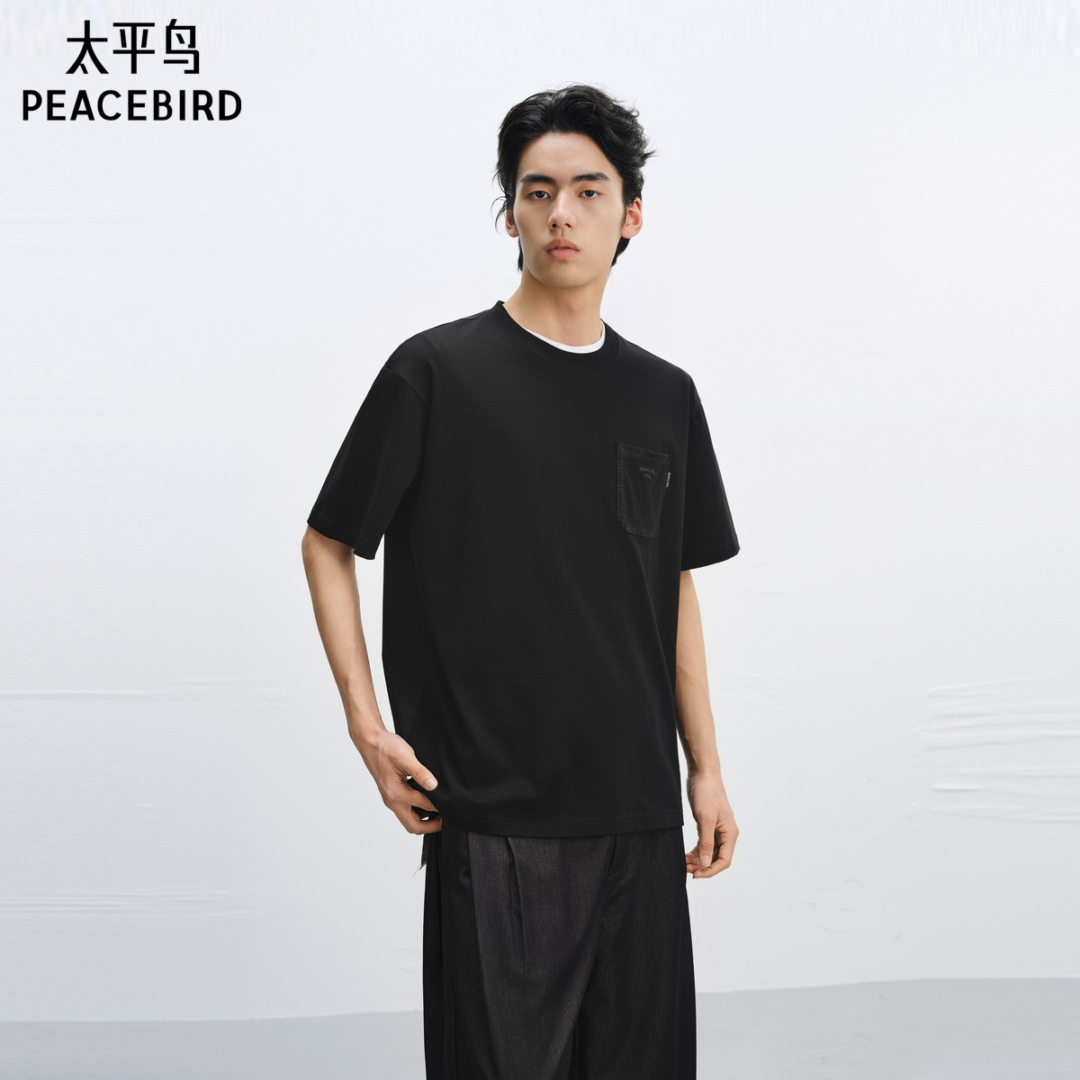 太平鸟男装 短袖体恤男夏季黑色胸前口袋设计宽松圆领短袖T恤