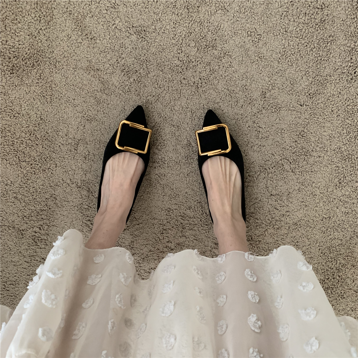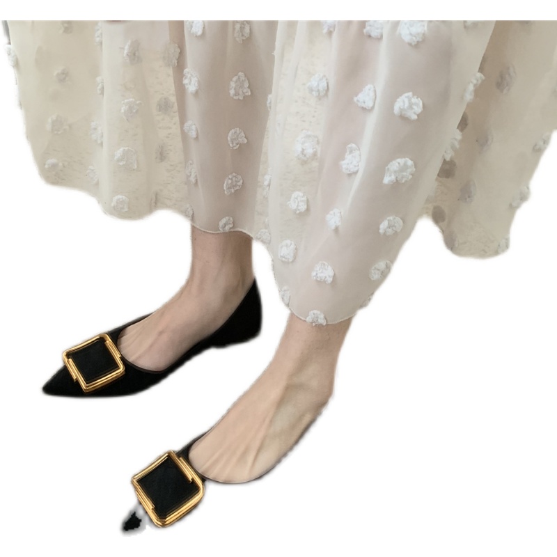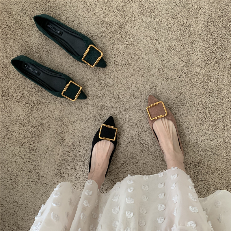 平底单鞋女鞋子低跟浅口尖头时尚休闲百搭软底方扣绒面瓢鞋√