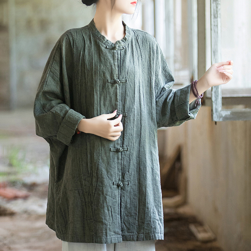 苎麻扎染衬衫女春秋2025新款中长款复古宽松上衣棉麻盘扣衬衣外套