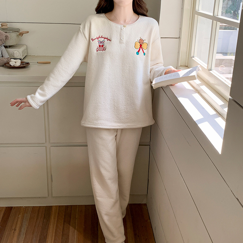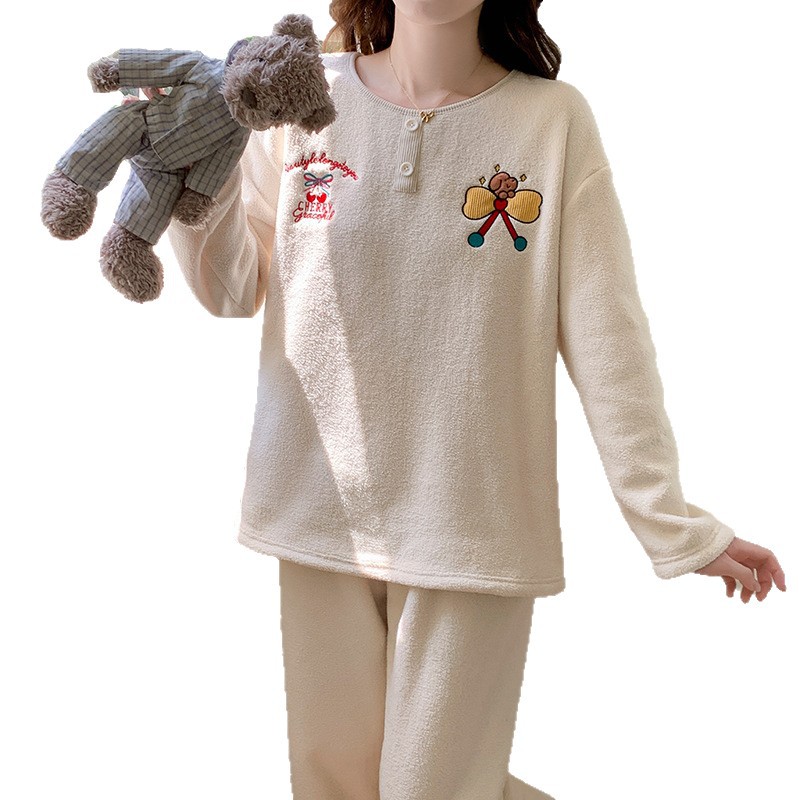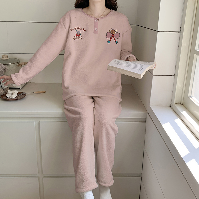 喔密哒珊瑚绒睡衣女秋冬季加厚法兰绒半边绒家居服保暖果粒绒套装