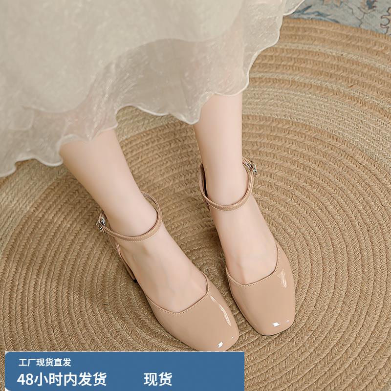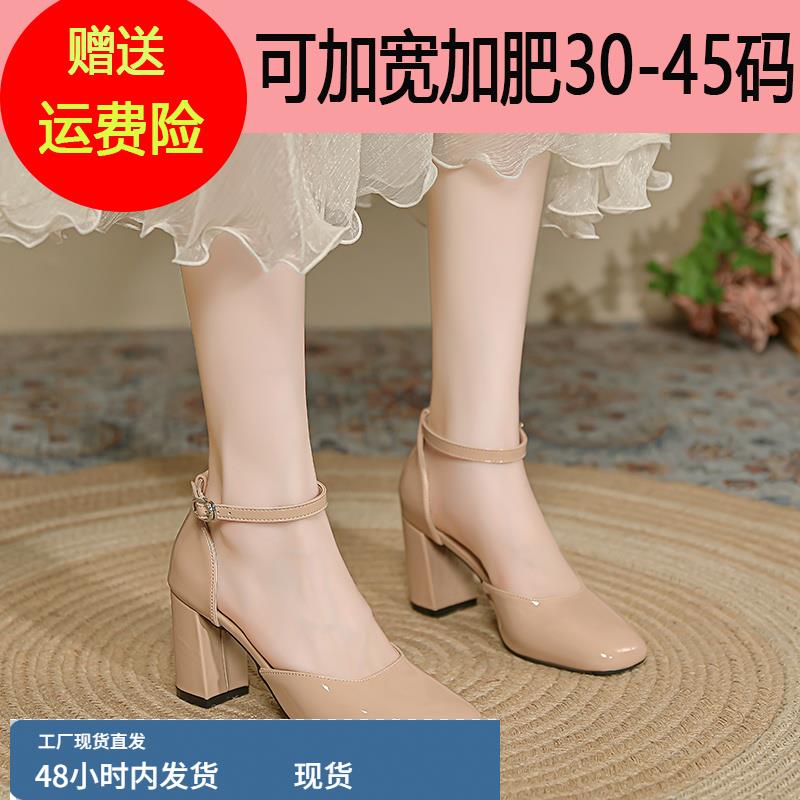 大码夏季凉鞋4143中空百搭方头粗跟女鞋一字扣宽胖脚舒适高跟鞋