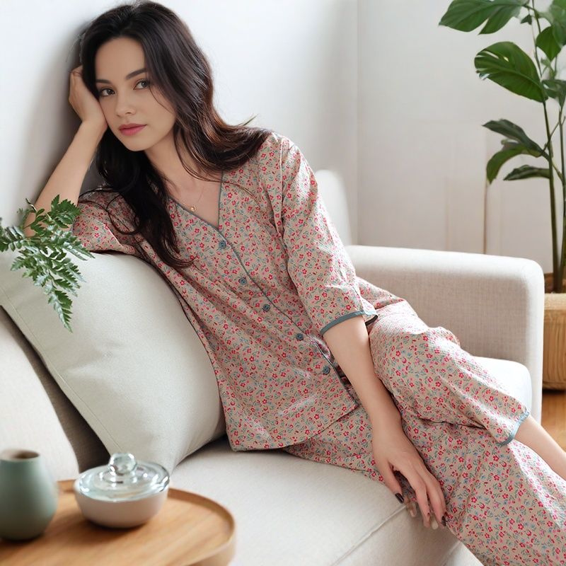 带胸垫睡衣女春夏季纯棉七分袖九分裤高档中年妈妈薄款家居服套装