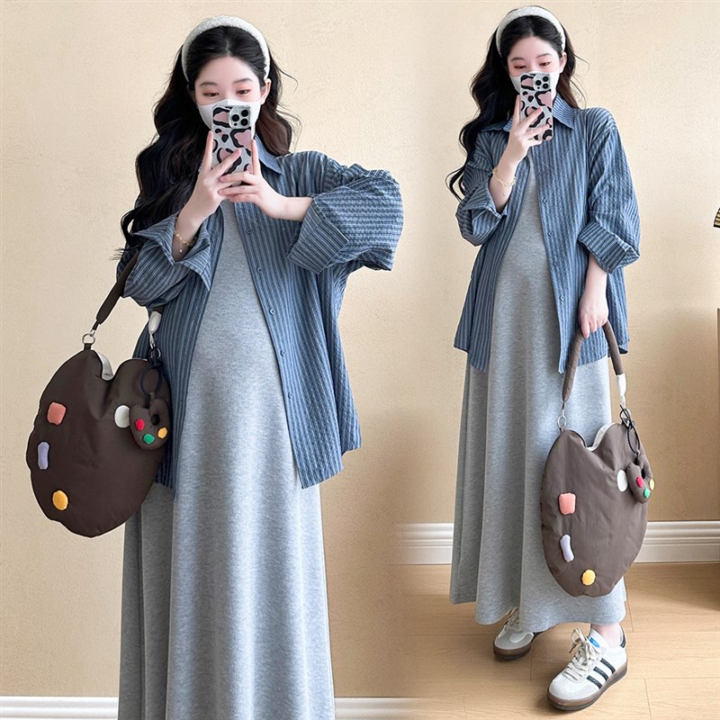 孕妇连衣裙套装春夏季外穿宽松条纹防H晒衬衣弹力背心连衣裙两件