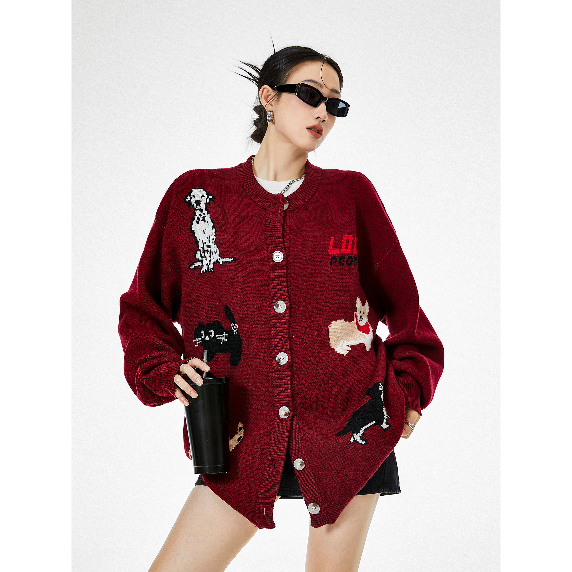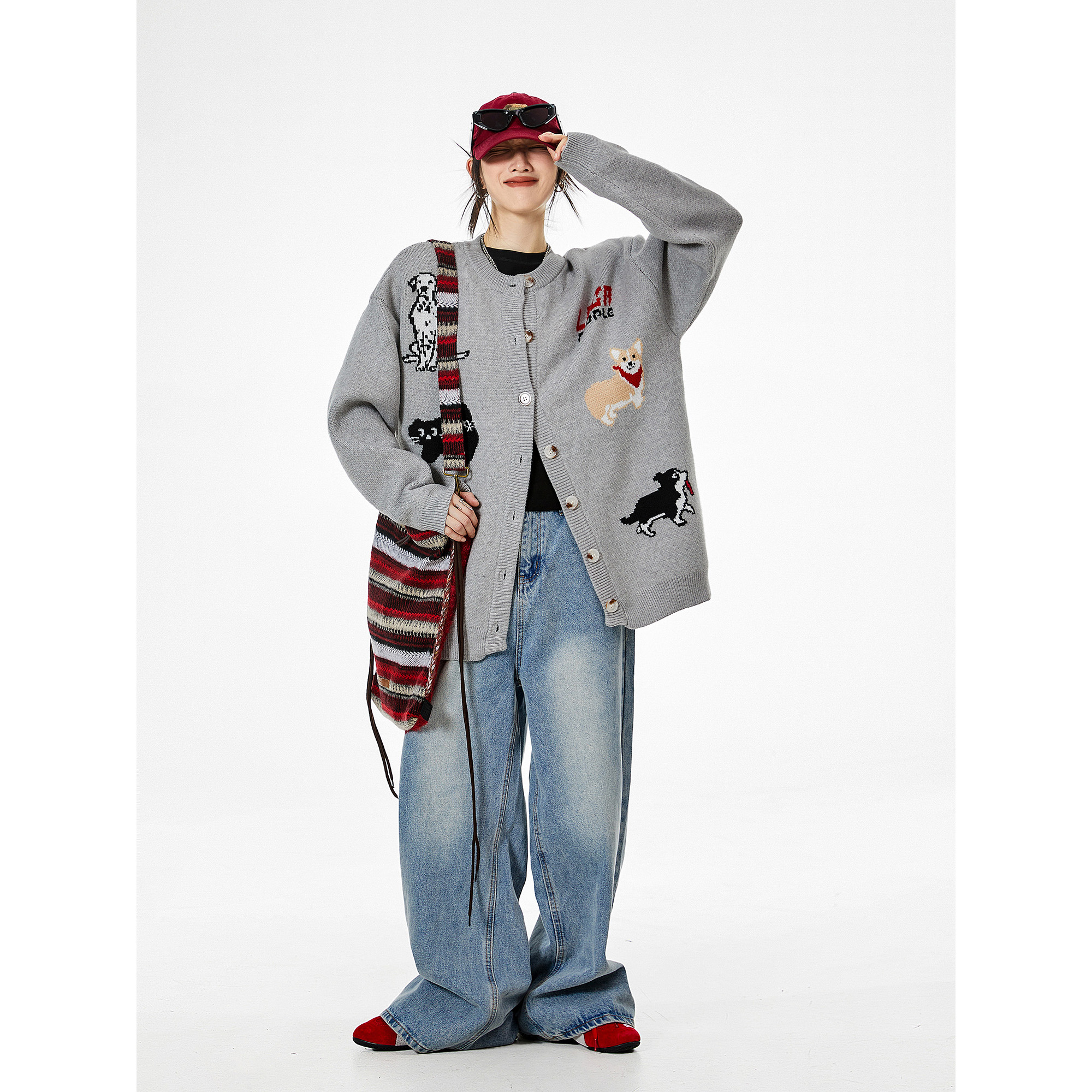 ICH MODE 美式复古小狗毛针织开衫女秋冬慵懒高级感休闲毛衣外套