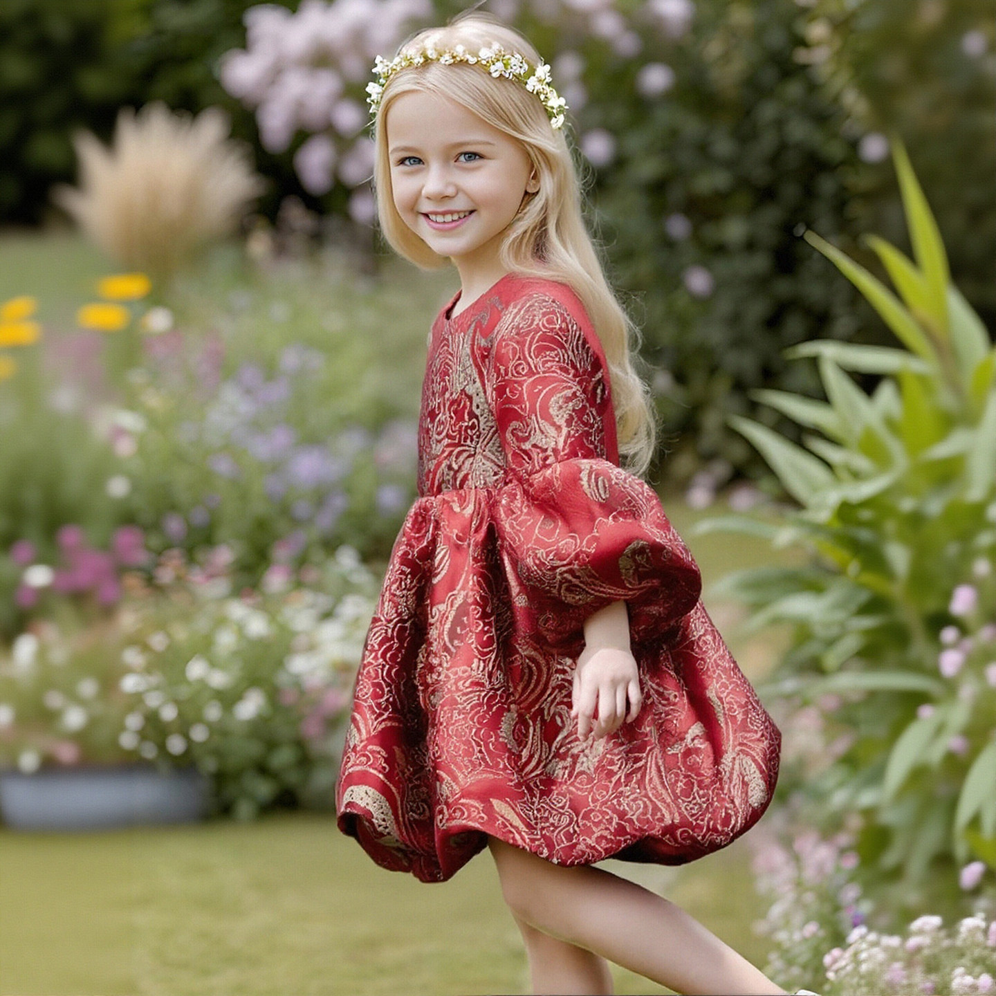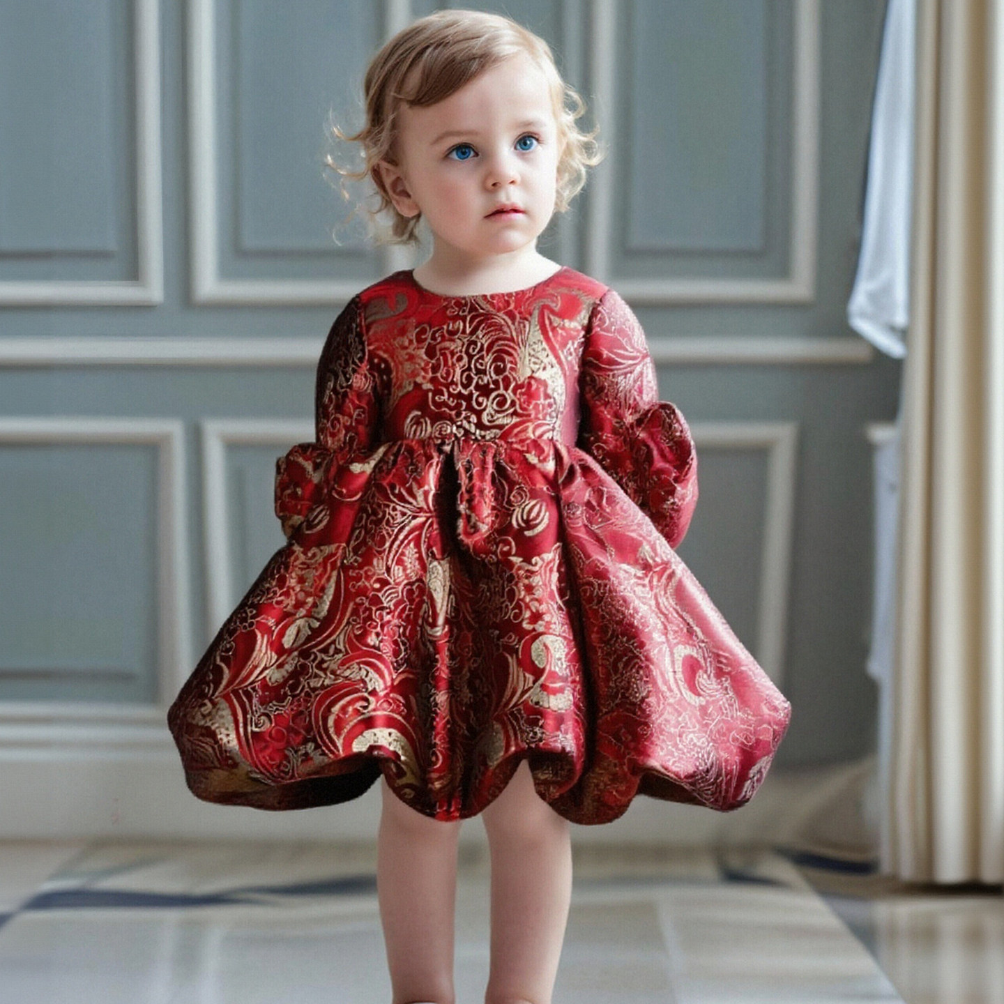 晨舞 女童秋冬新款长袖连衣裙儿童中小宝公主红色宫廷风生日旅行