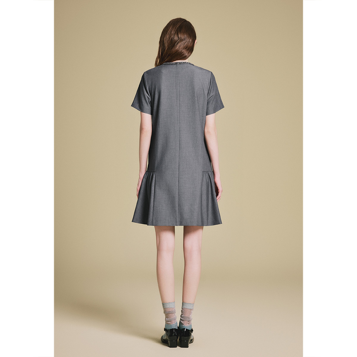 诗篇专选高级感气质钉珠领口亚麻混纺小香风连衣裙2025春季新款