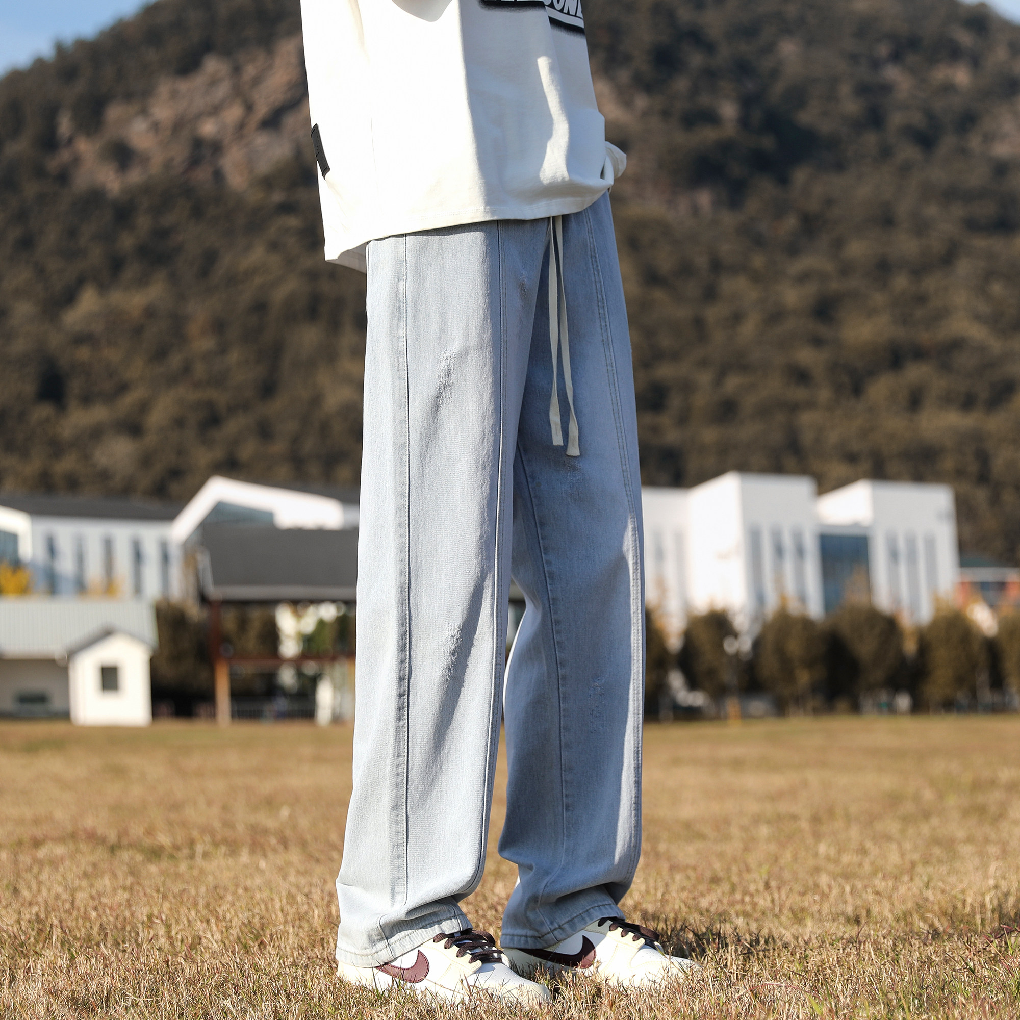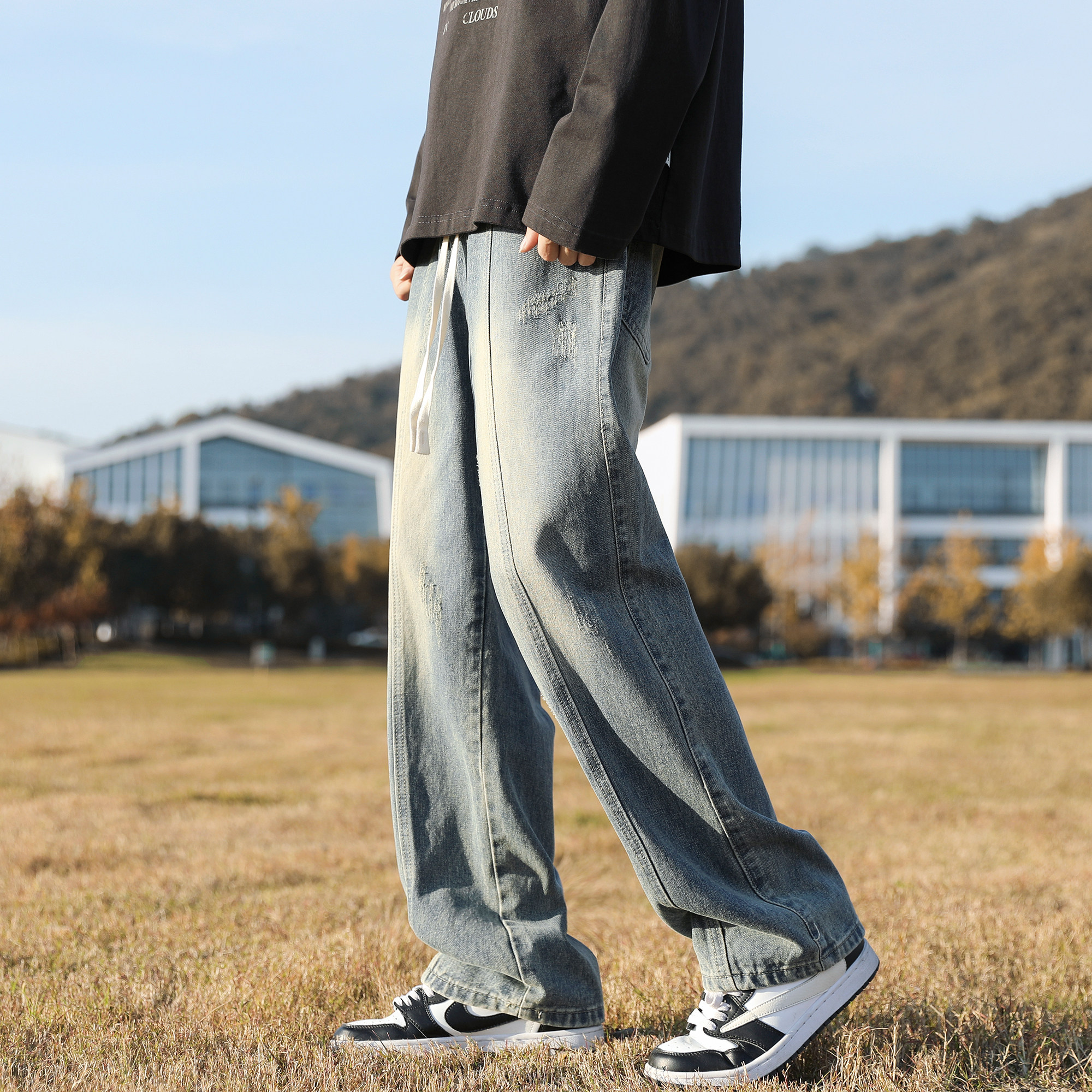 二更美式拼接直筒牛仔裤男春秋季复古潮流男生青少年宽松休闲裤子