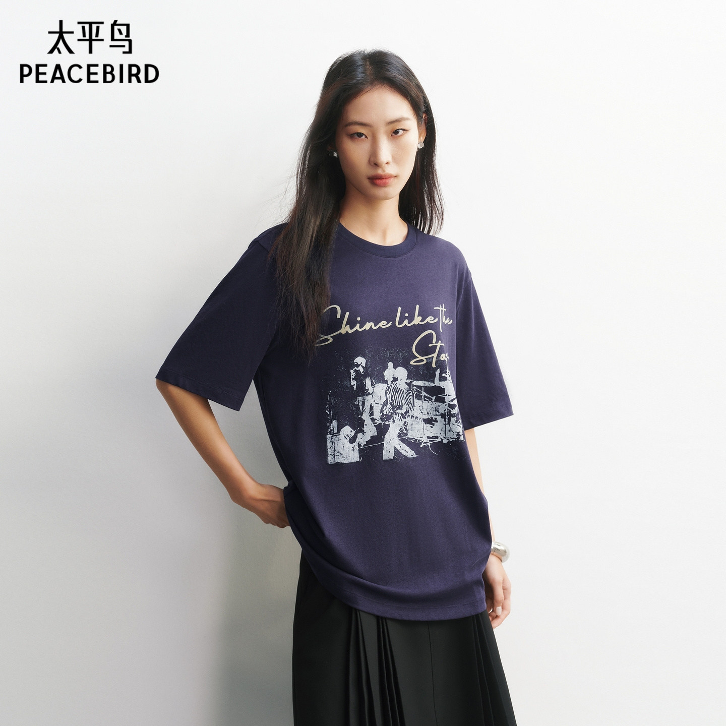 太平鸟摩登酷飒摇滚风图案短袖T恤26春夏新款女士仿麻感宽松上衣