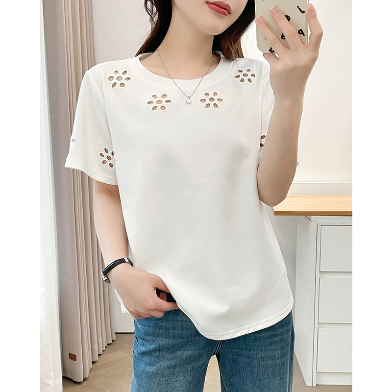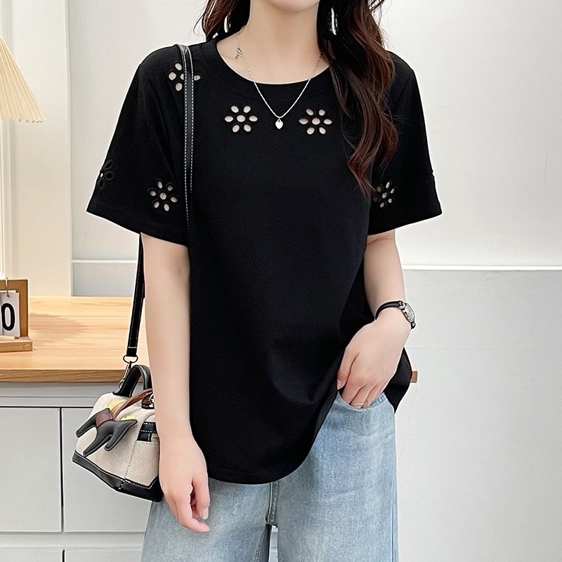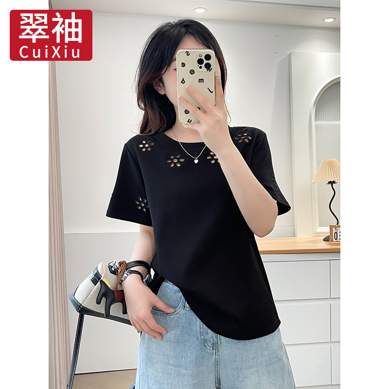 翠袖大码女装胖mm纯棉镂空花朵短袖T恤女夏季设计感休闲显瘦上衣