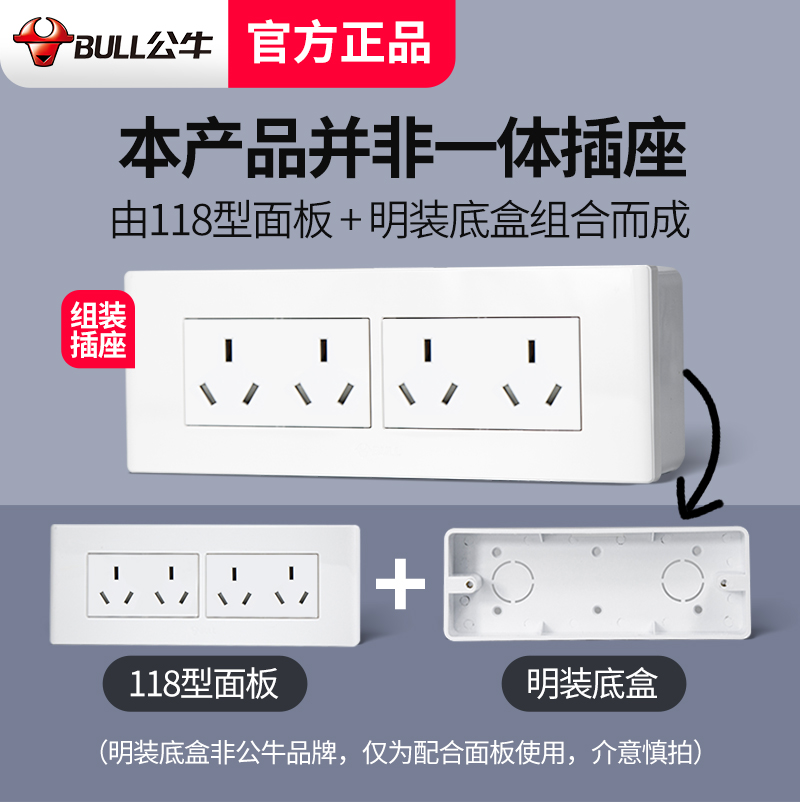 公牛118大功率三孔双16A插座明装专用面板六孔多孔空调热水器插座