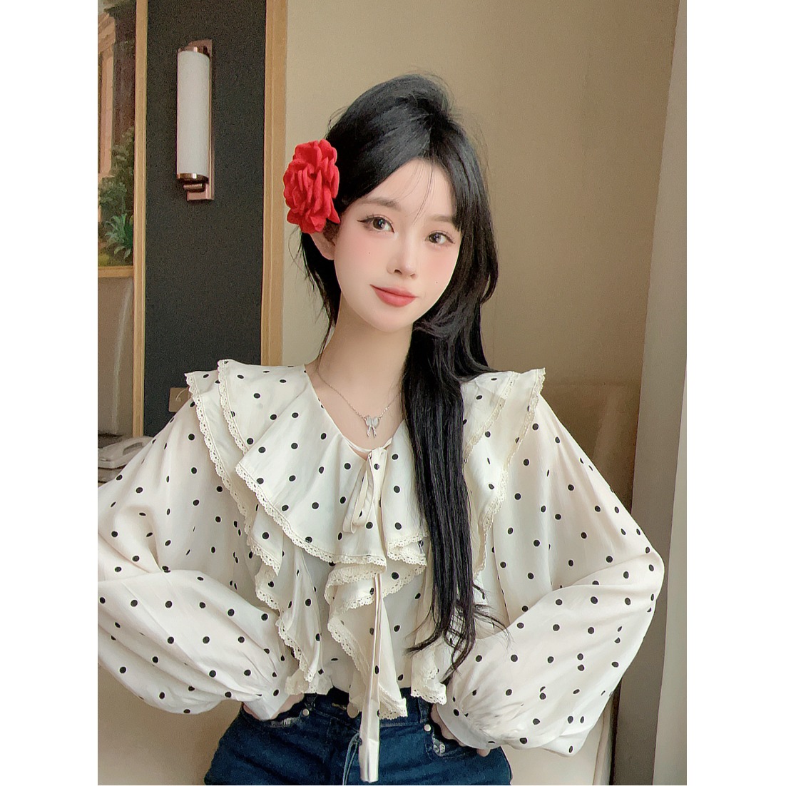 大码胖mm法式荷叶边波点衬衫女夏季新款宽松显瘦韩系别致雪纺小衫
