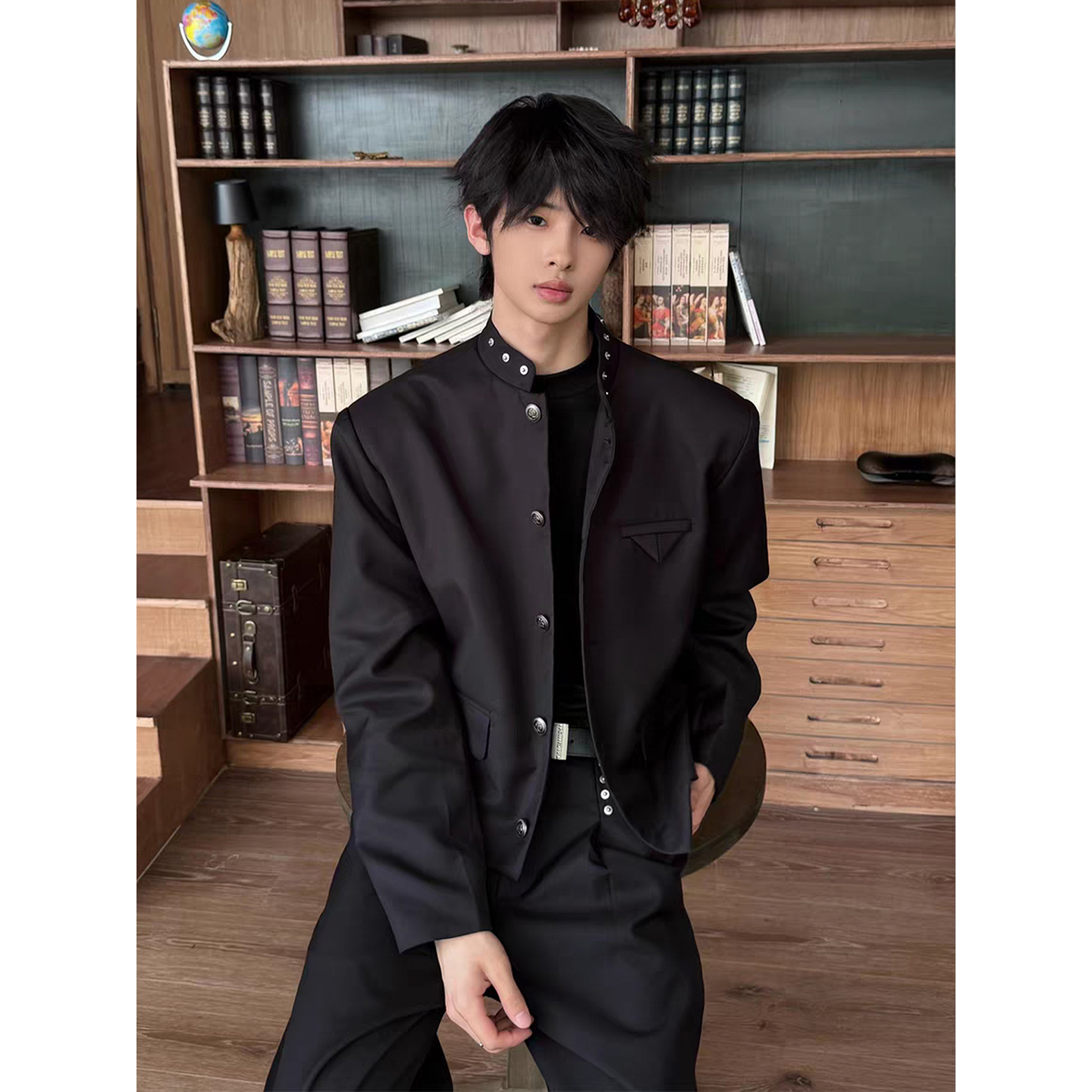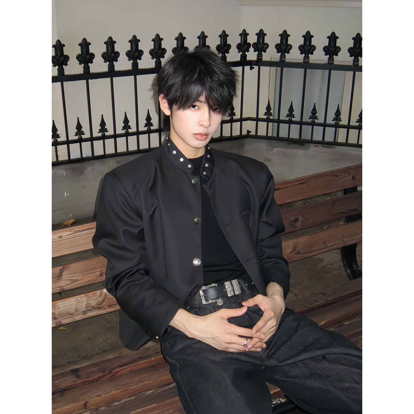高级感炸街小西装男款小众设计感铆钉立领西服廓形垫肩dk单西外套