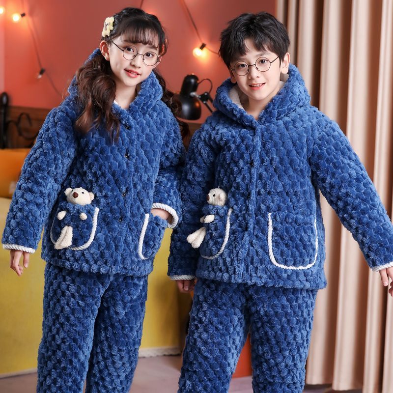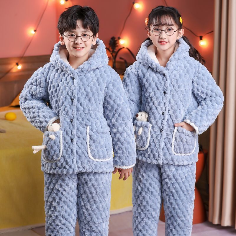 儿童冬季睡衣三层夹棉加厚男童女童中大童珊瑚绒法兰绒家居服套装